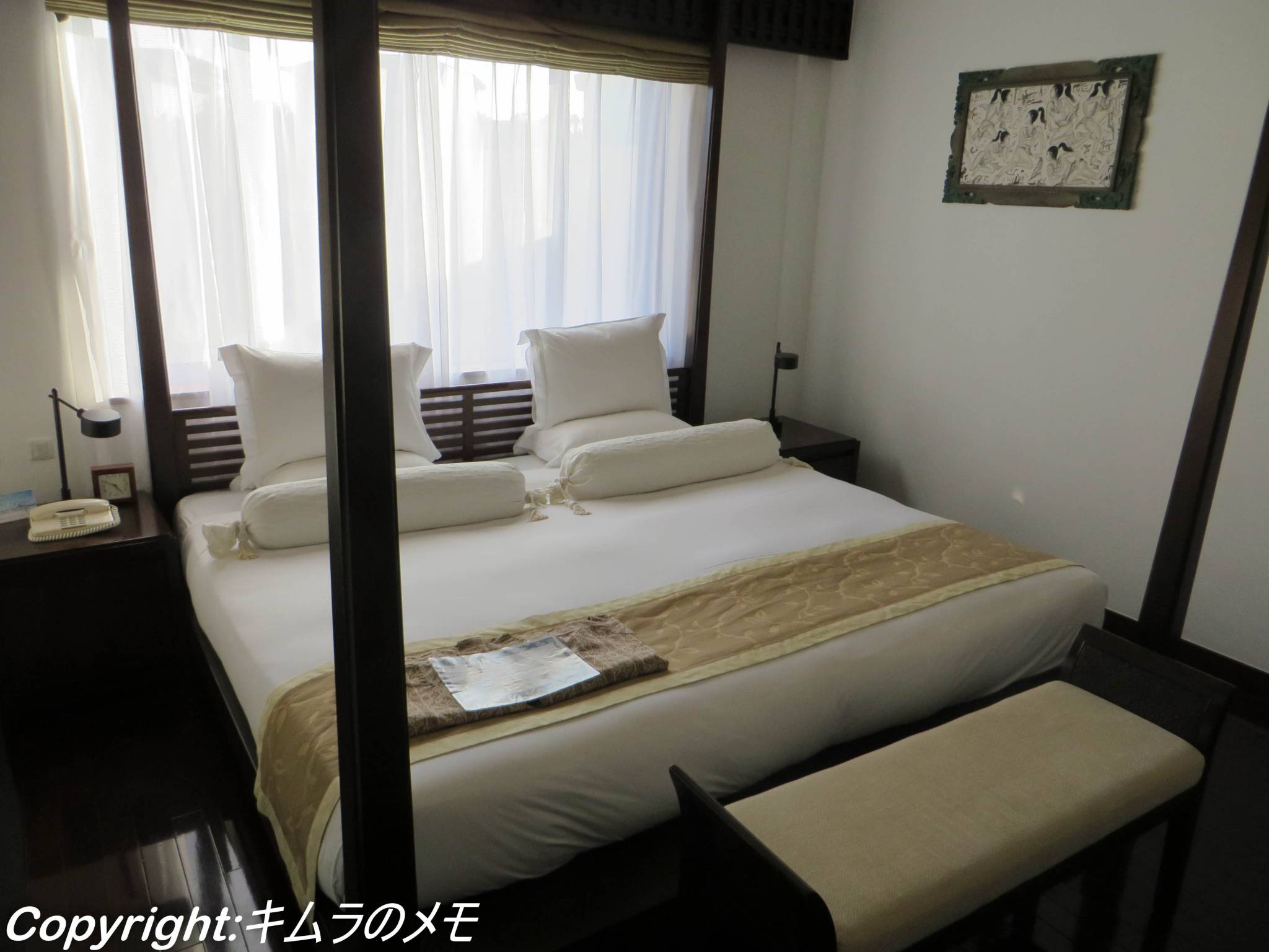 ベッドルームも10畳程度、ベッドはキングサイズ2つ分位で、もはや2人でも広すぎる状況であった。