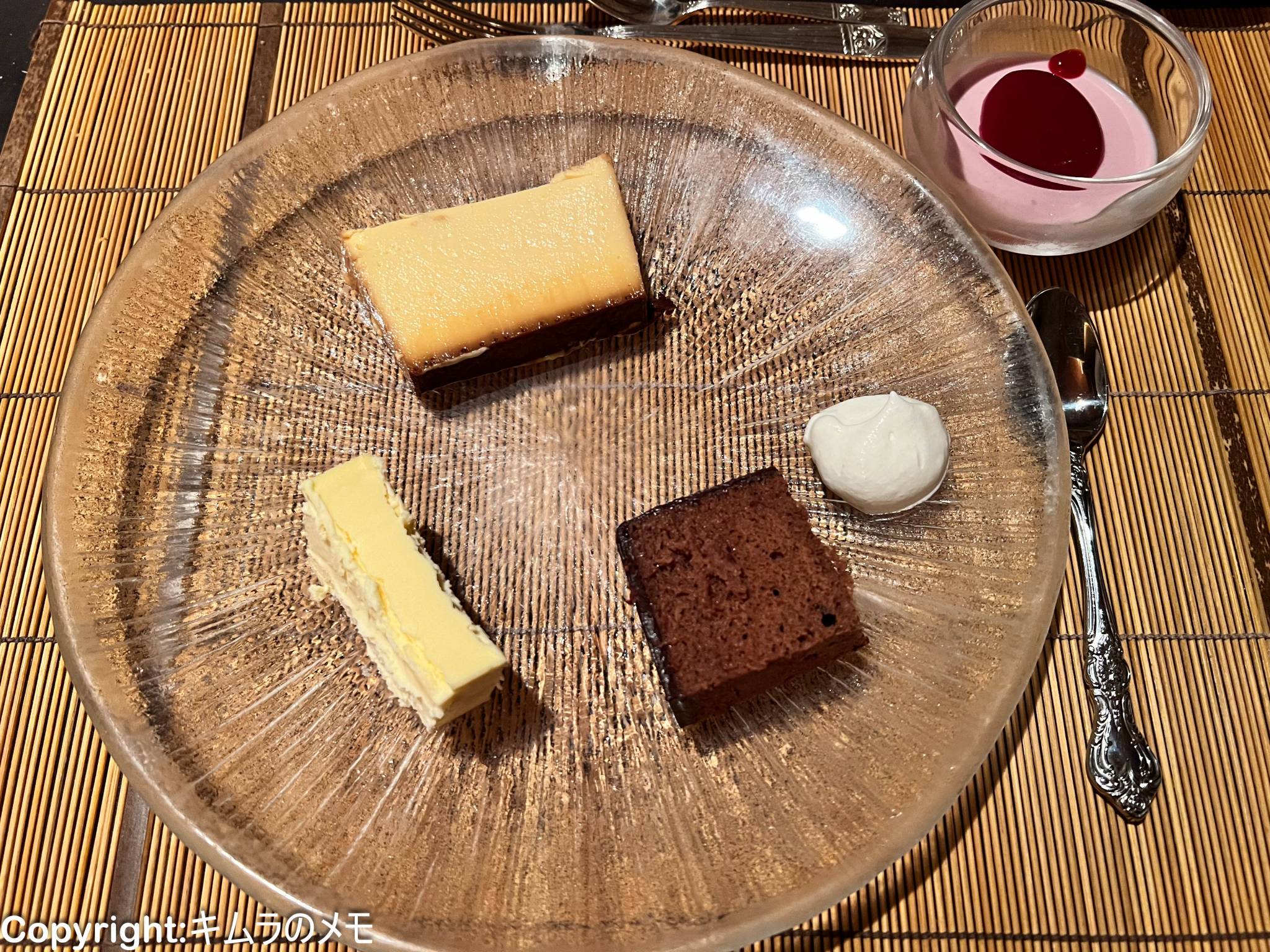 デザートはワゴンサービスでの提供で7種類程度ある中から4種類を選んで2口サイズ程度に盛り付けての提供。