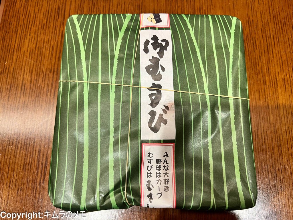 包み紙に書いてある「みんな大好き 野球はカープ むすびはむさし」のキャッチフレーズが何ともほっこりする。
