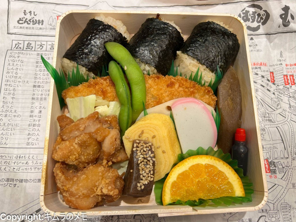 安芸むすびという名前の由来はいまいちわからないが、いわゆる揚げ物が入った弁当という感じ。