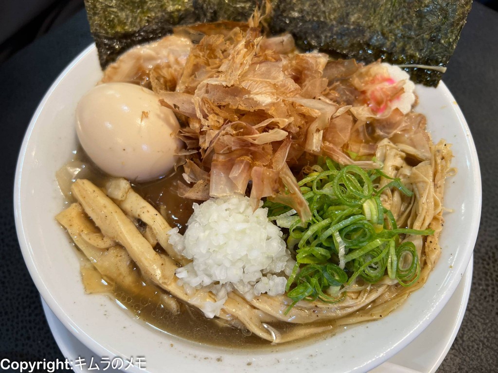 ただ、麺はつけ麺とは異なるものを使っており、スープは煮干しの濃さと鶏油とカツオの風味がバランスよくまじりあうもの。