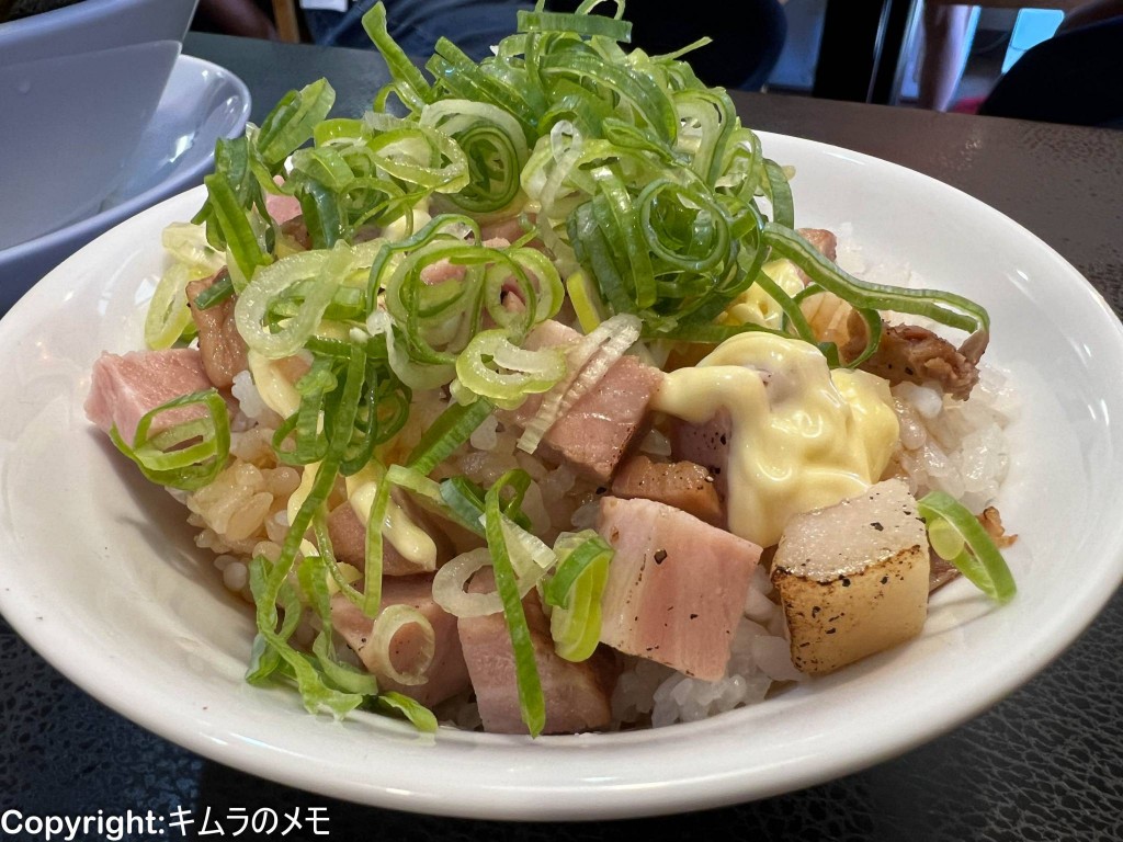さいの目状にカットされたゴロゴロチャーシューの上に刻みネギがたっぷりと乗せられ、そこにマヨネーズが添えられている。