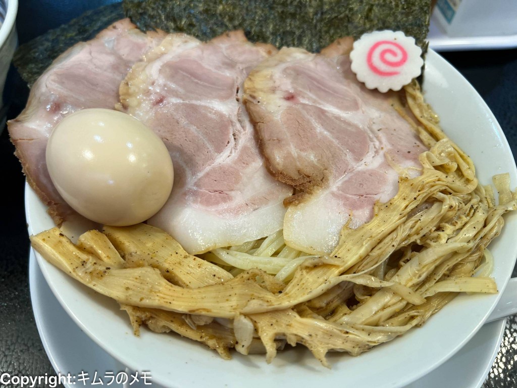 今回は特製でオーダーしたこともあり、トッピングとして穂先めんまが5本、チャーシュー3枚、そして味玉と海苔が添えられている。
