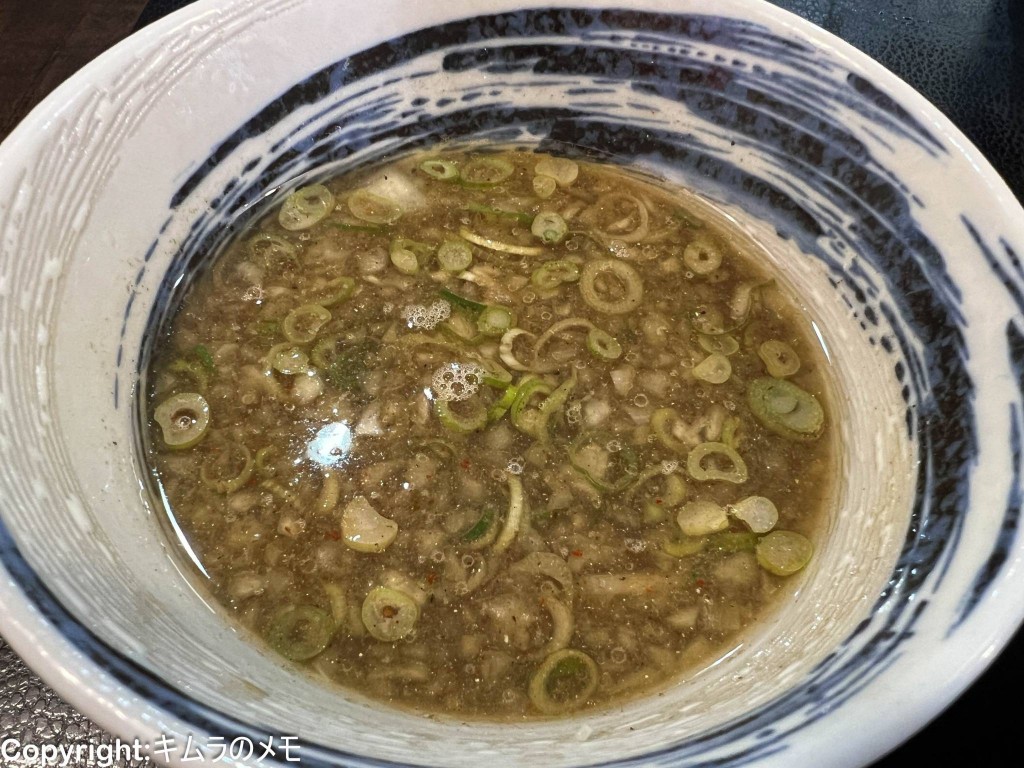 アツアツの状態で提供されるつけダレは表面に少し脂の層があるつけダレには刻みネギがたっぷりと入ってたもので、煮干しの旨味と魚介系の風味がしっかりと効いた味わいになっている。