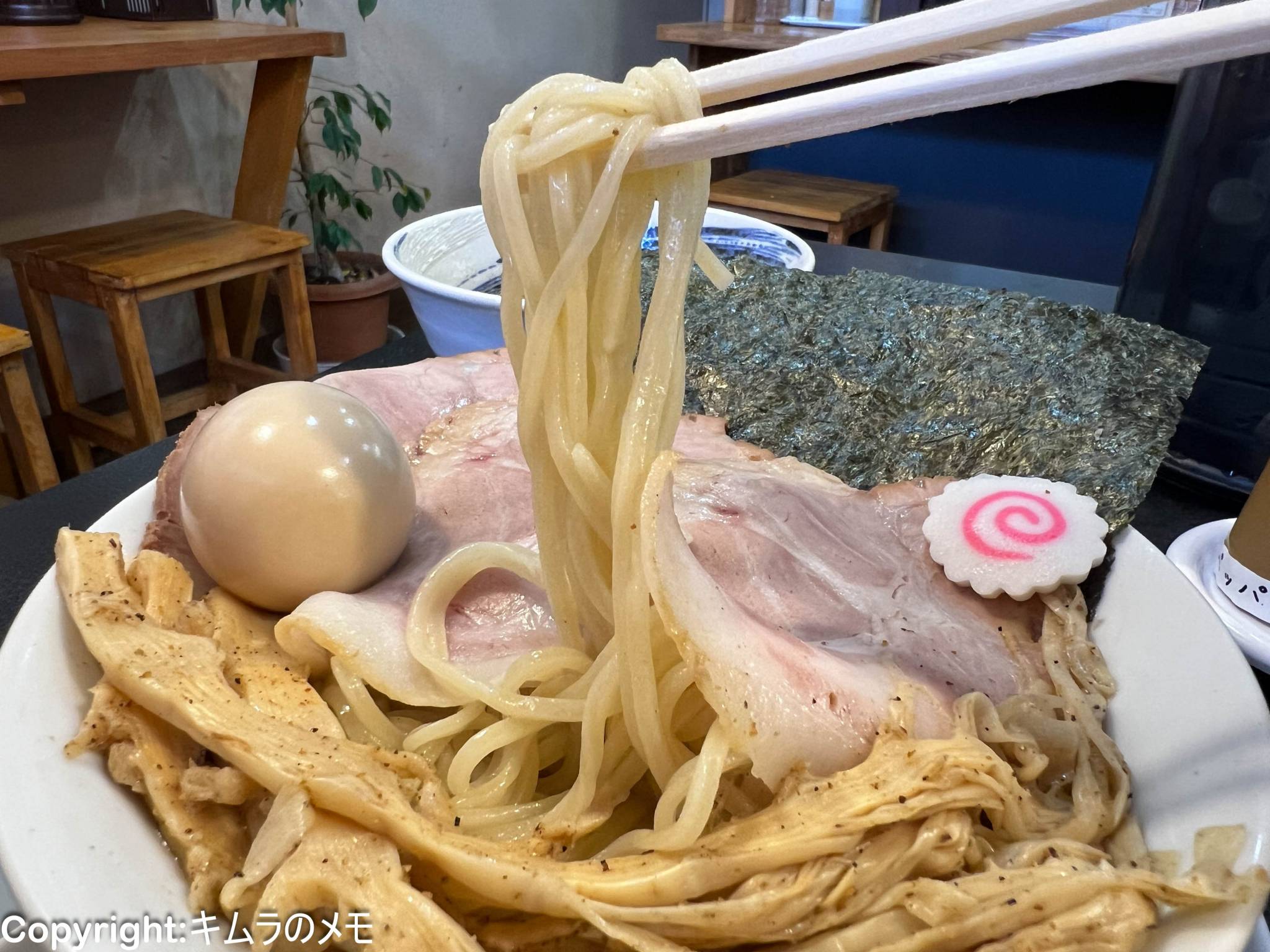 なお、こちらのつけダレはいわゆるセメント系では無く、煮干しのエグミはかなり抑えられており、逆に甘味とピリ辛感、そしてほのかな酸味が加わる何とも表現しがたい癖になる味わいとなっている。