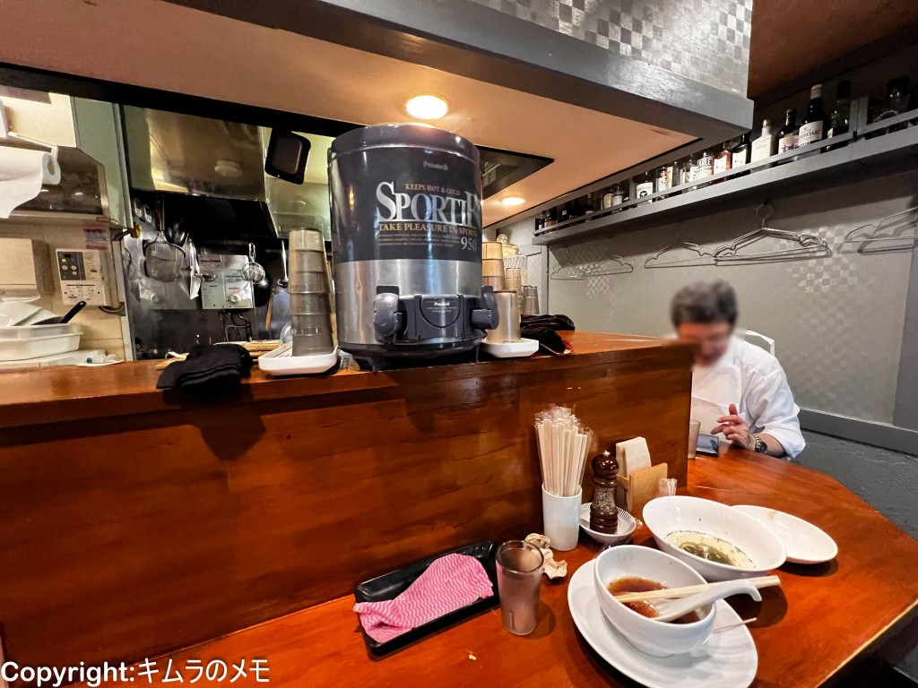 店内は厨房を囲むようにL字型に席が配されているが、出入口に面していない席の場合は出入りに気を使う。