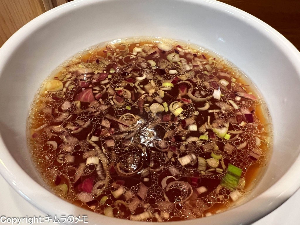 つけダレということでそれなりに濃さはあるものの、ベースが醤油ということもあり普通にスープとしても飲めるような濃さに仕上げられている。