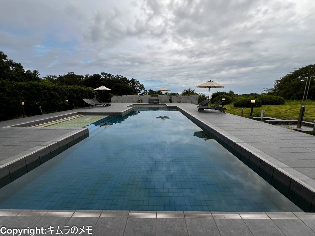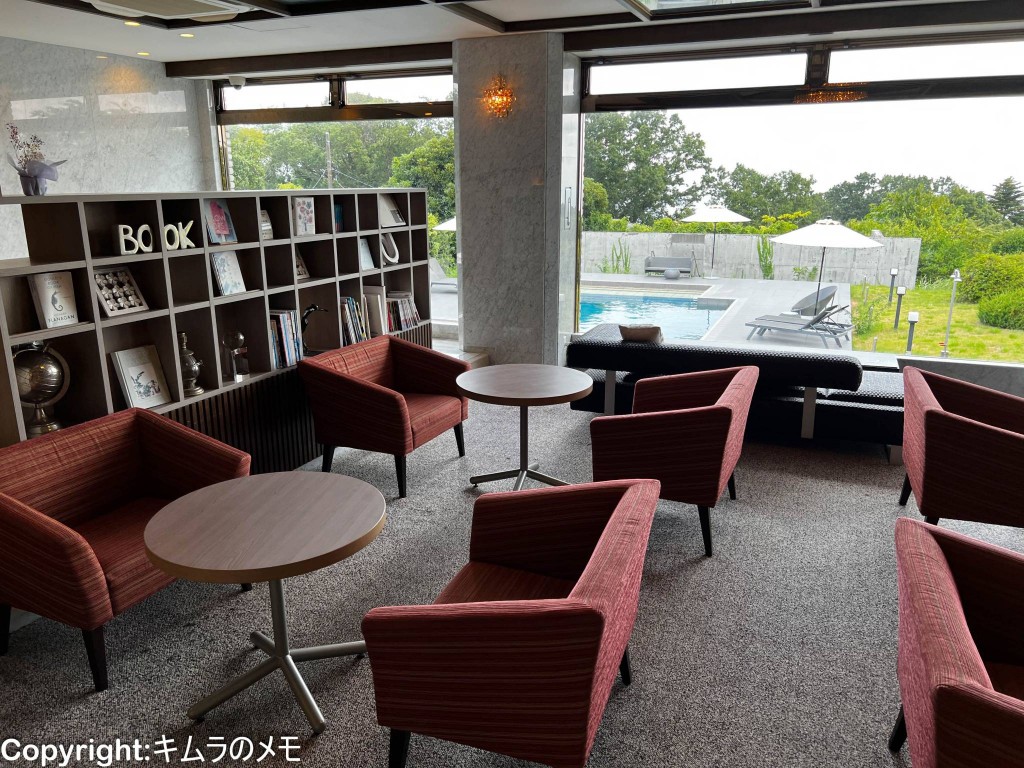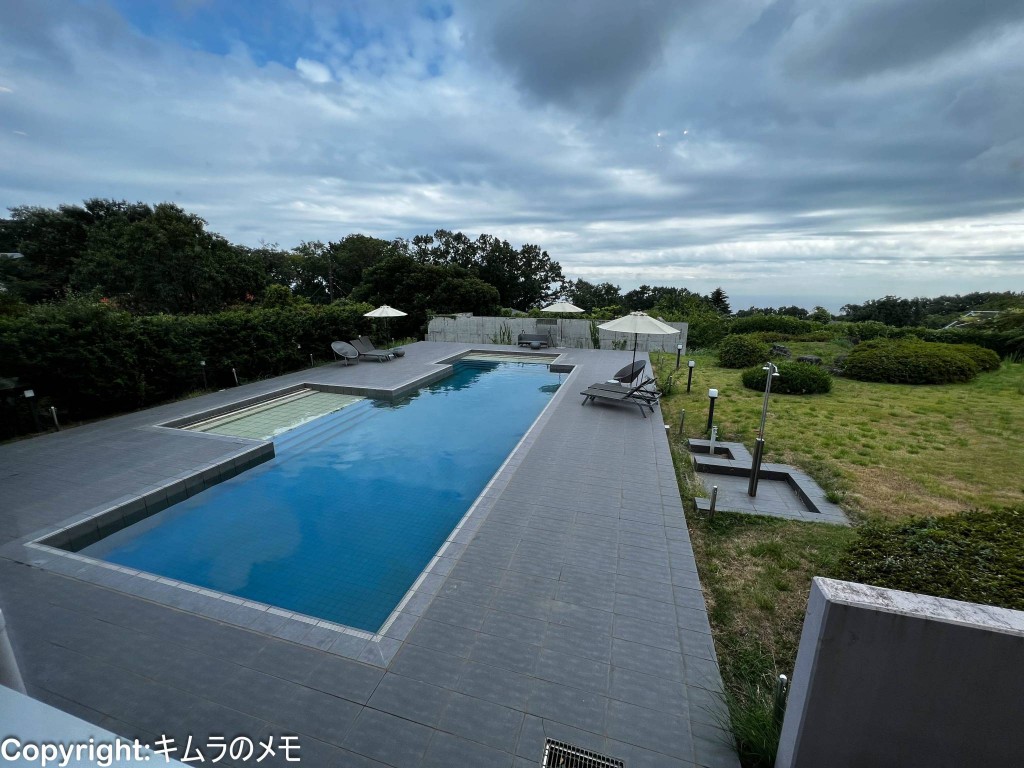 あいにくの天気だったが、晴れていれば大きな窓の向こうにプールと海が見えるよう。