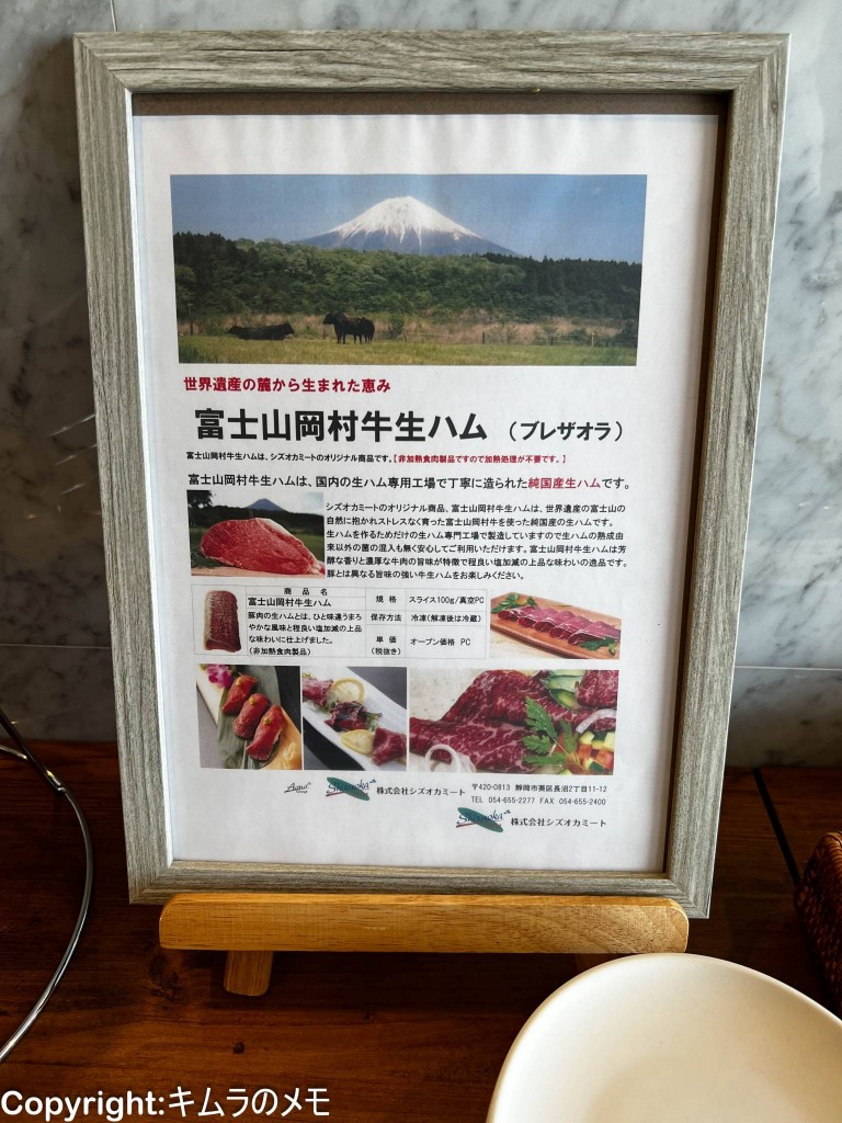 また、日替わりで他にも何種類かのおつまみが提供されるようだが、この時は「富士山岡村牛生ハム」が提供されていた。