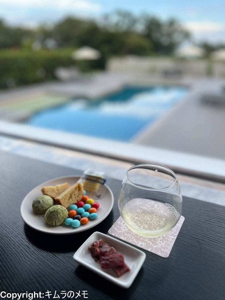 そのプールを見ながら頂くワインとおつまみで優雅なひと時を過ごせる。
