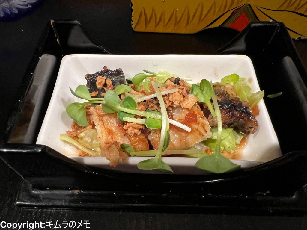 「ぼんじりと生ハム」は提供されたときのビジュアルとしては正直マッチングがあまりピンとこなかったのだが、実際に頂くと想像以上に相性が良い。