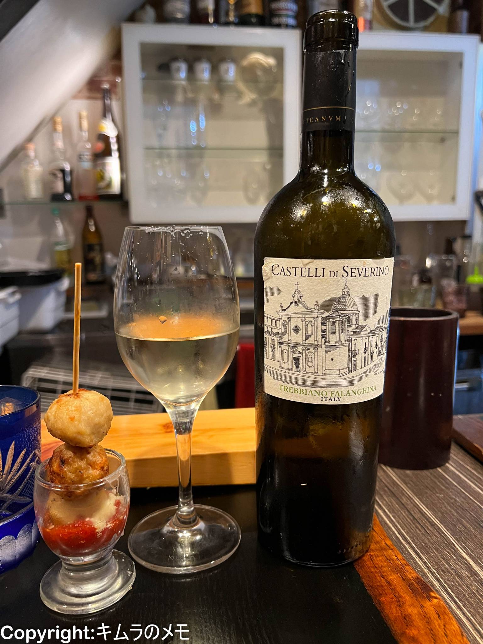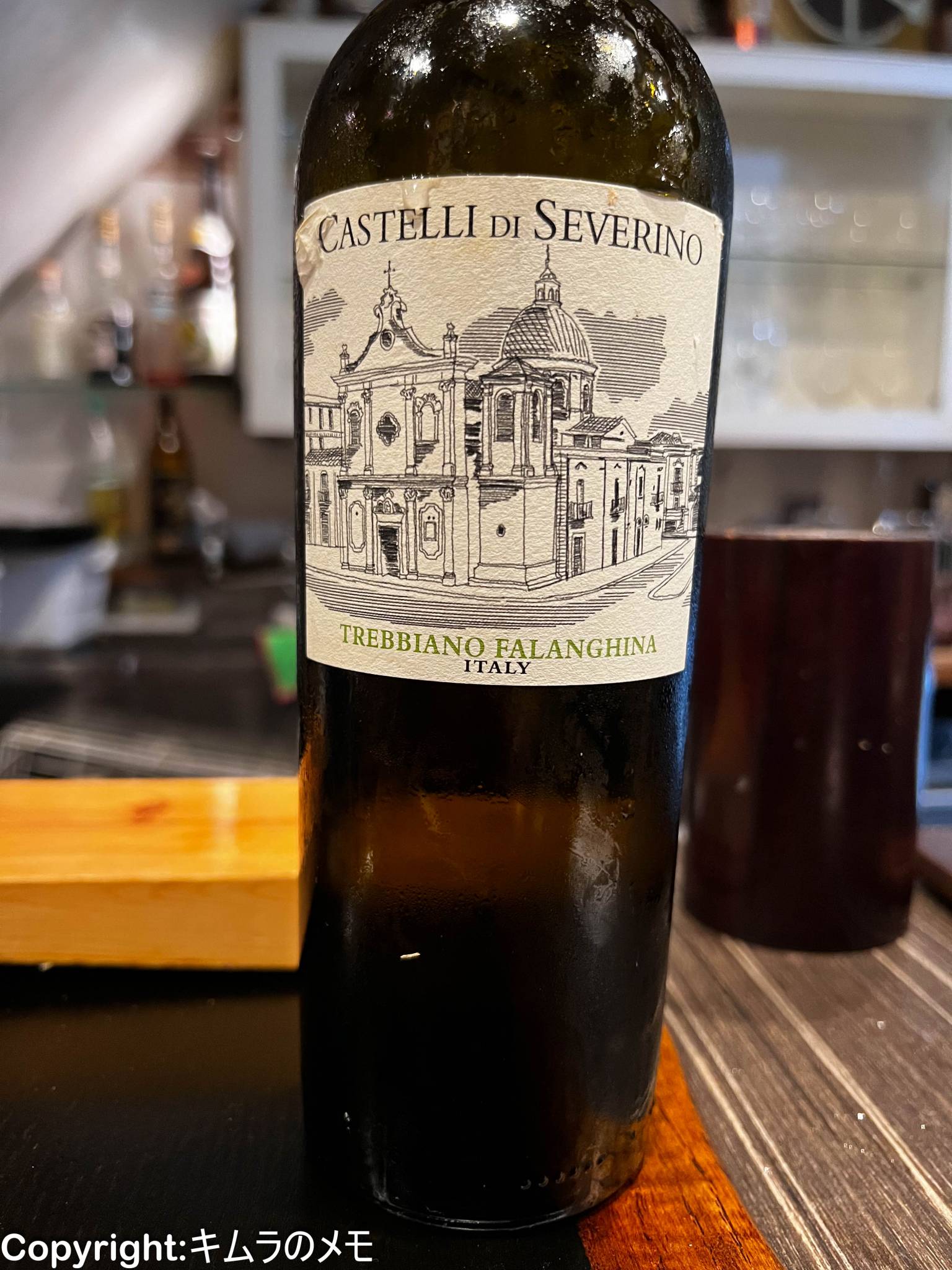 オーダーしたワインは「プーリア ビアンコ」という表現で書かれていたが、実際にはイタリアのテアヌムが作る「Castelli di Severino Puglia Bianco」(市価1200円程度)であった。