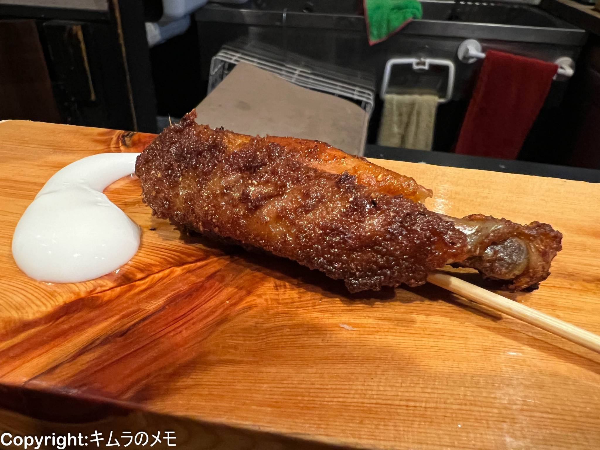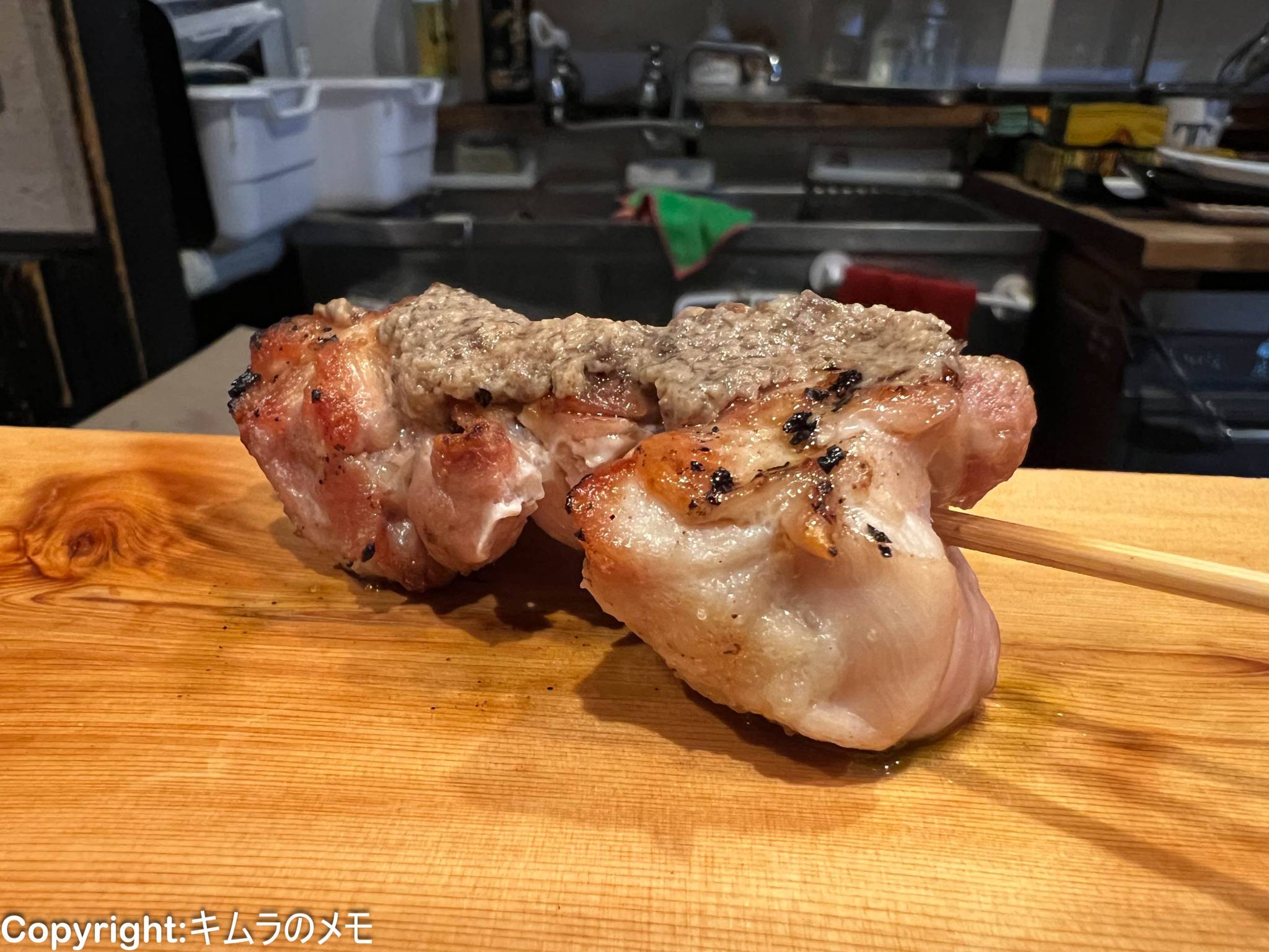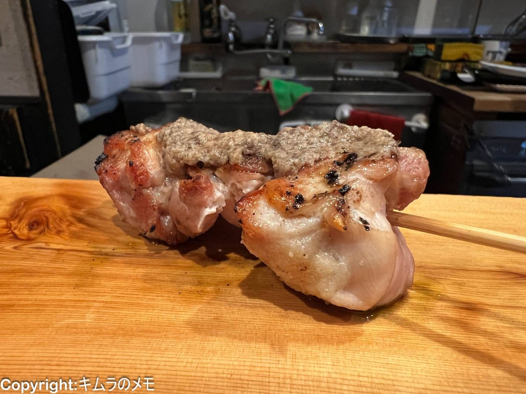 砂肝を一旦コンフィ状に仕上げてから改めて串打ちして焼き上げていることもあり、いわゆる砂肝のコリコリ感ははなく、外の部分はカリっとして中はしっとりという食感が面白い。