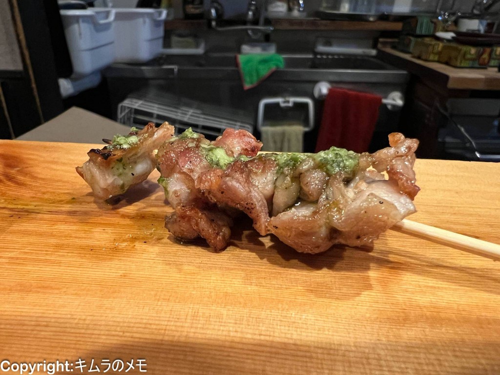 続いては「せせりのバジルソース仕立て」という、これまた面白い串が提供された。
