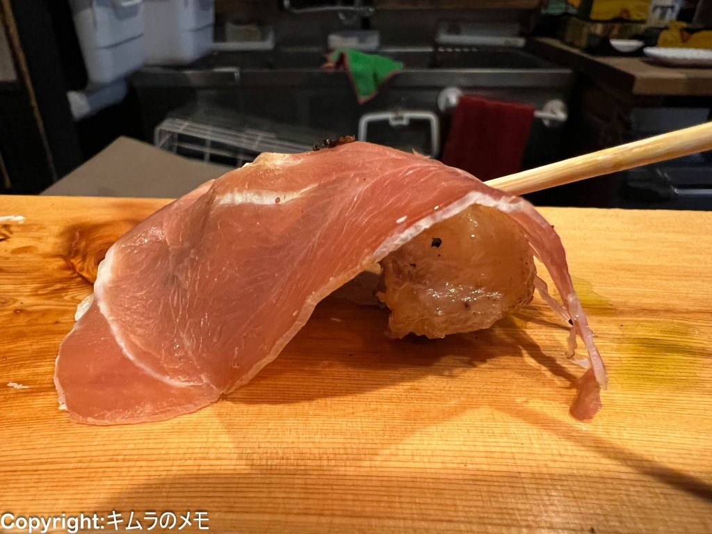 ぼんじりの脂感と生ハムの塩味のコンビネーションが絶妙で、なぜこの組み合わせを今まで誰も考えなかったのだろうというくらい美味しく、ワインにもマッチする。
