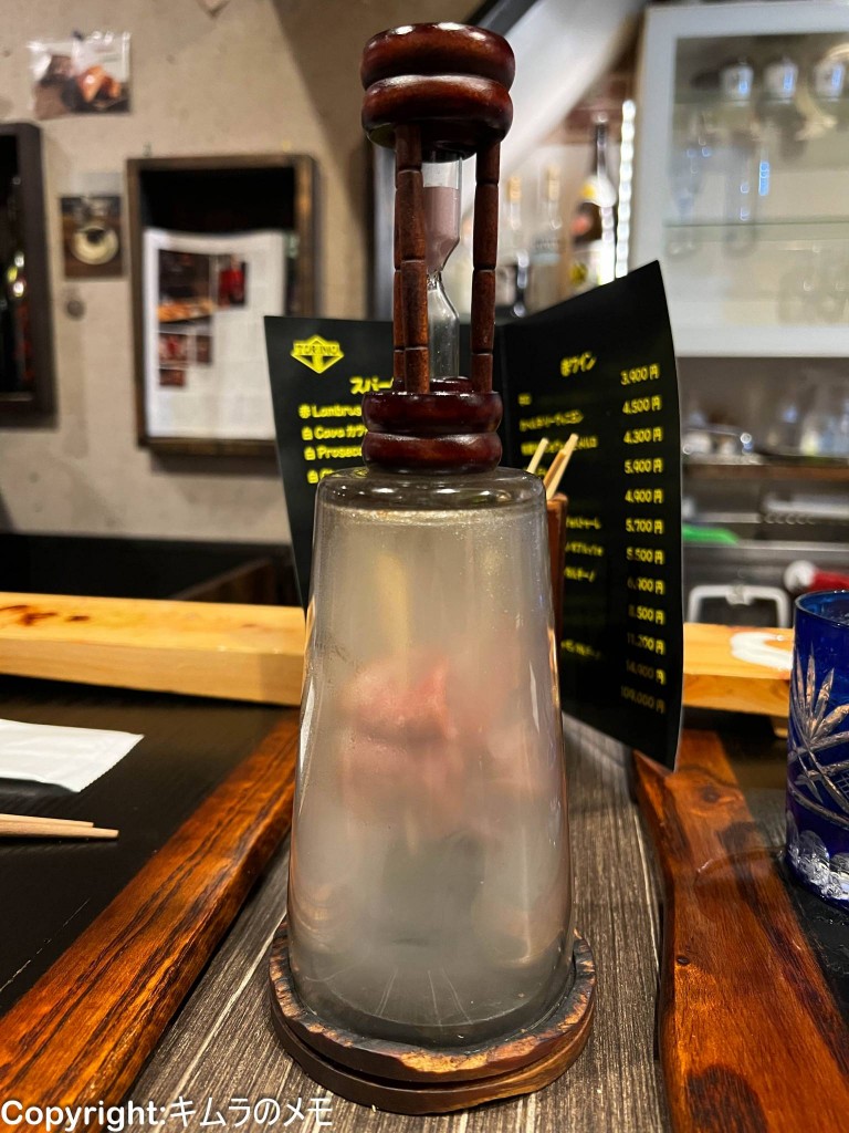 目の前でスモークされた鴨肉を砂時計の砂が落ちるまで待ってから頂く。