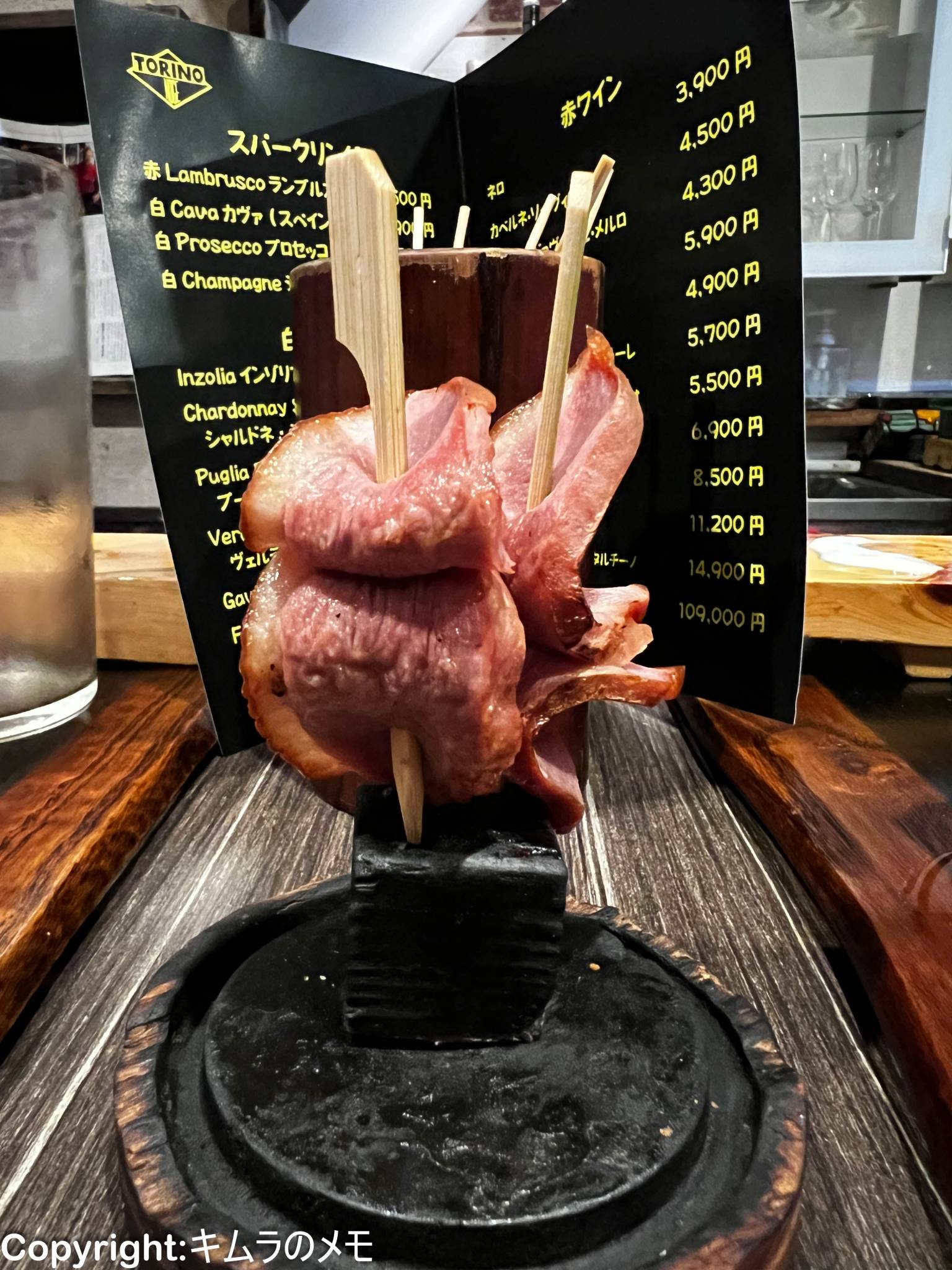 今回は9本の串料理と白ワインボトルを1本、そして赤ワインのデキャンタをオーダーして2名で12000円弱、1名あたり6000円程度の仕上がりであった。
