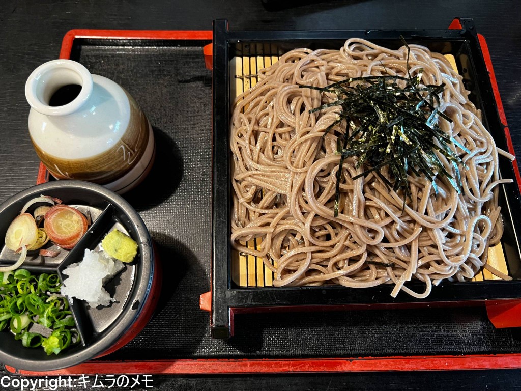 シンプルに「ざるそば」を頂いたが、蕎麦粉感はほどほどに感じられ、ツルツルと喉ごしで楽しむタイプでは無く、若干ごわごわとした存在感のあるタイプなのでしっかりと蕎麦を食べるという感じのもの。