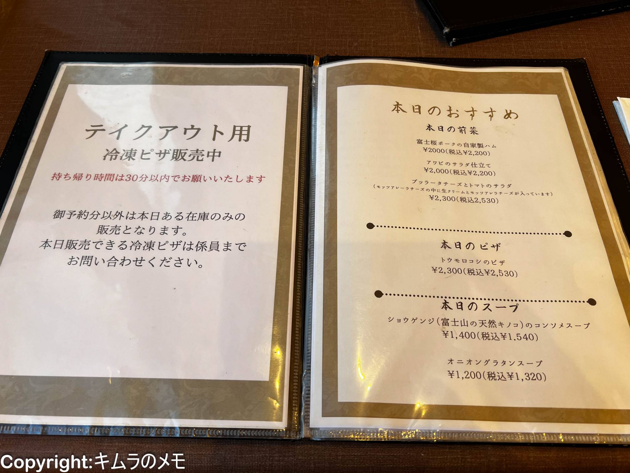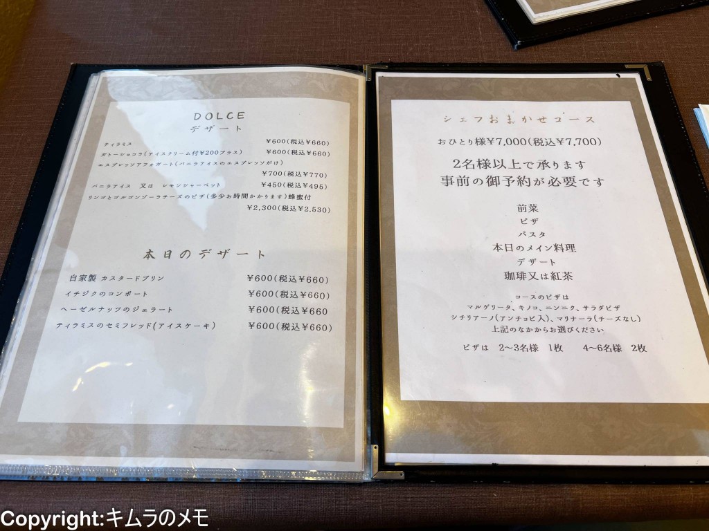 また、事前予約ということで、1名7000円のコース(前菜・ピザ・パスタ・メイン・デザート)もあるよう。