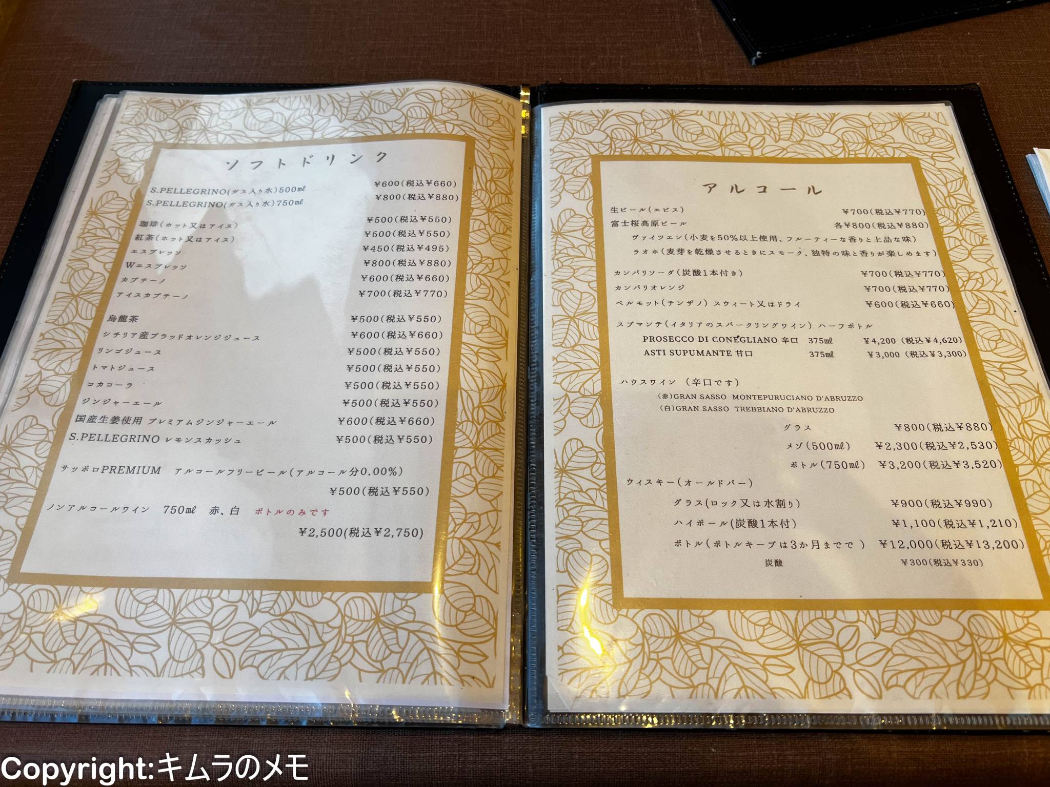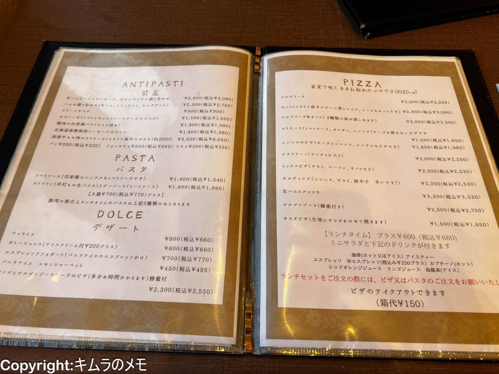 こちらのお店はイタリアン、その中でもピザ推しということで、ピザのメニューが充実している一方で、パスタは2種類のみとなっている。