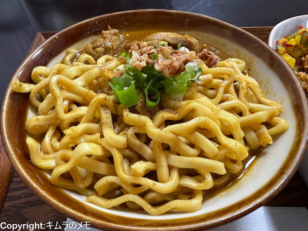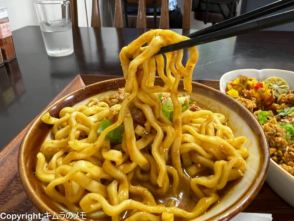平打ちで非常に強く縮れた特徴的なビジュアルの麺はトロみのついたカレーに良くマッチする。