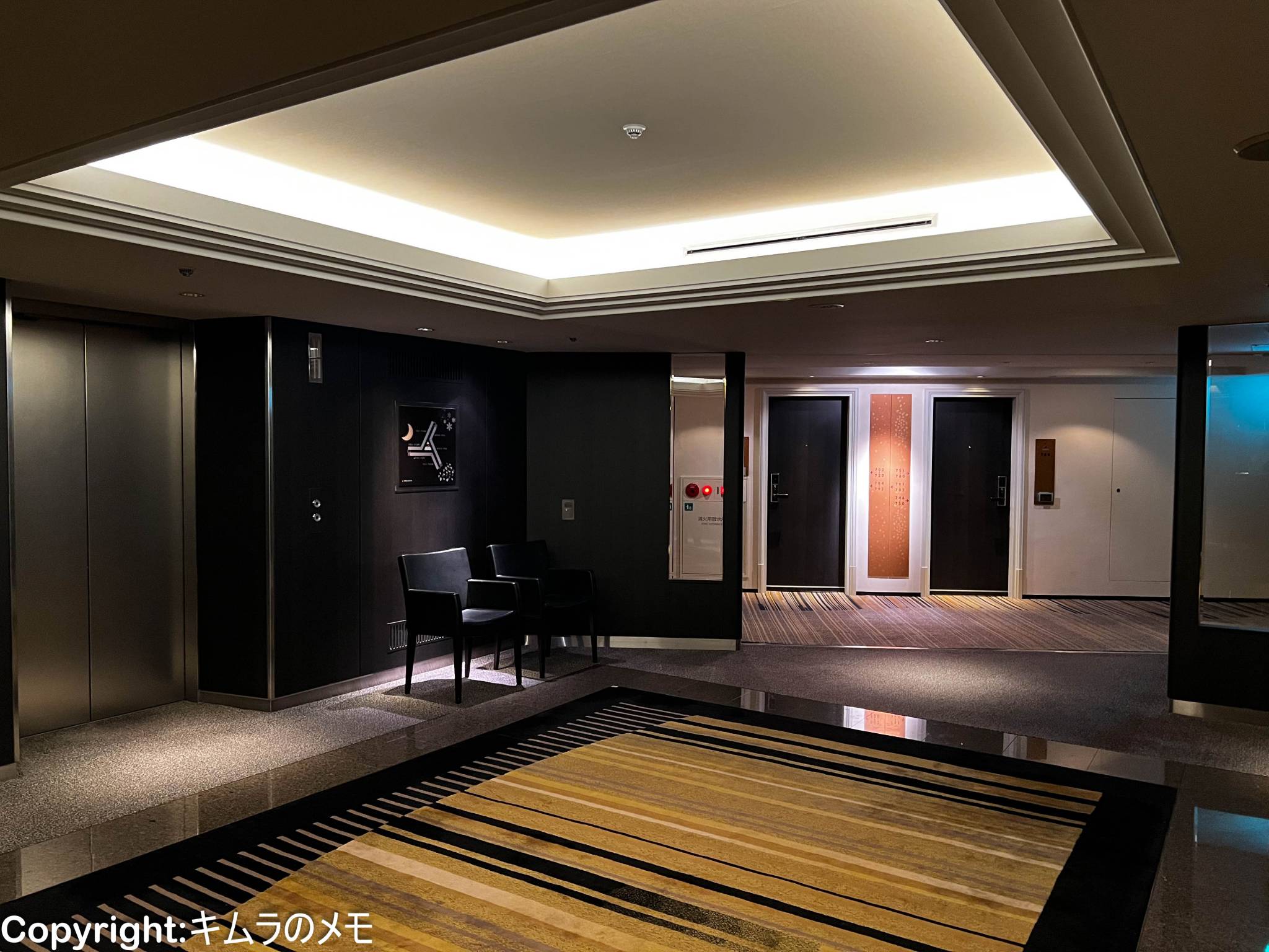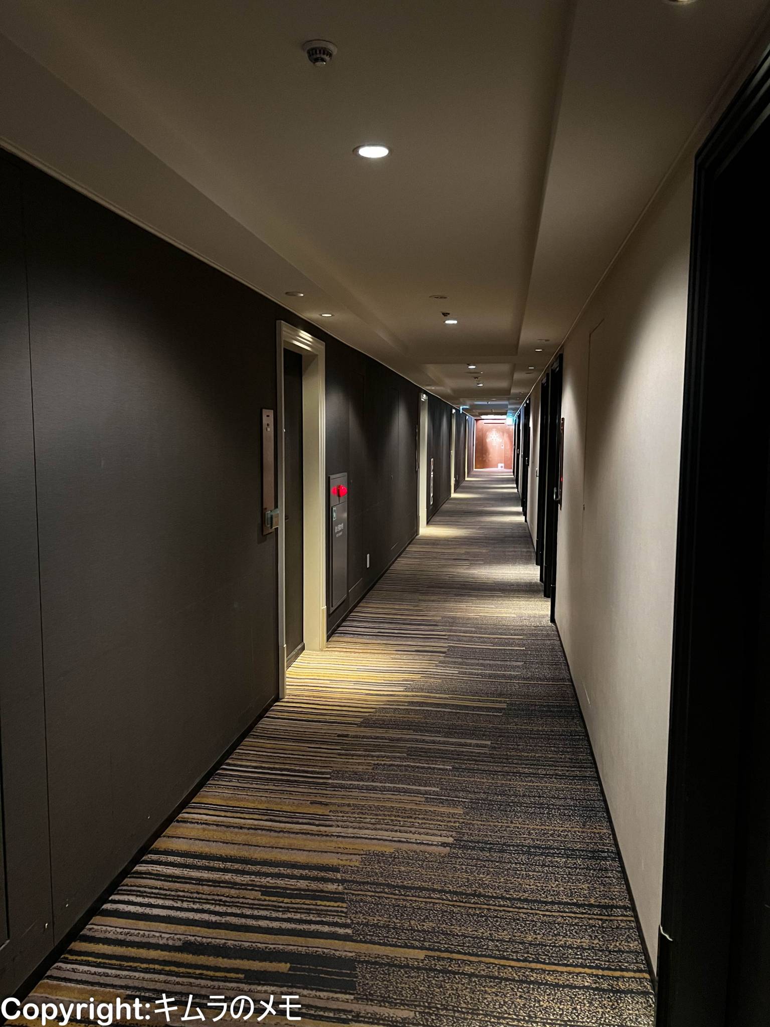 エレベーターホールから客室に向かうが、こちらも照明が落とされ落ち着いた色合いにまとめられていることもあってか高級感を感じられる。