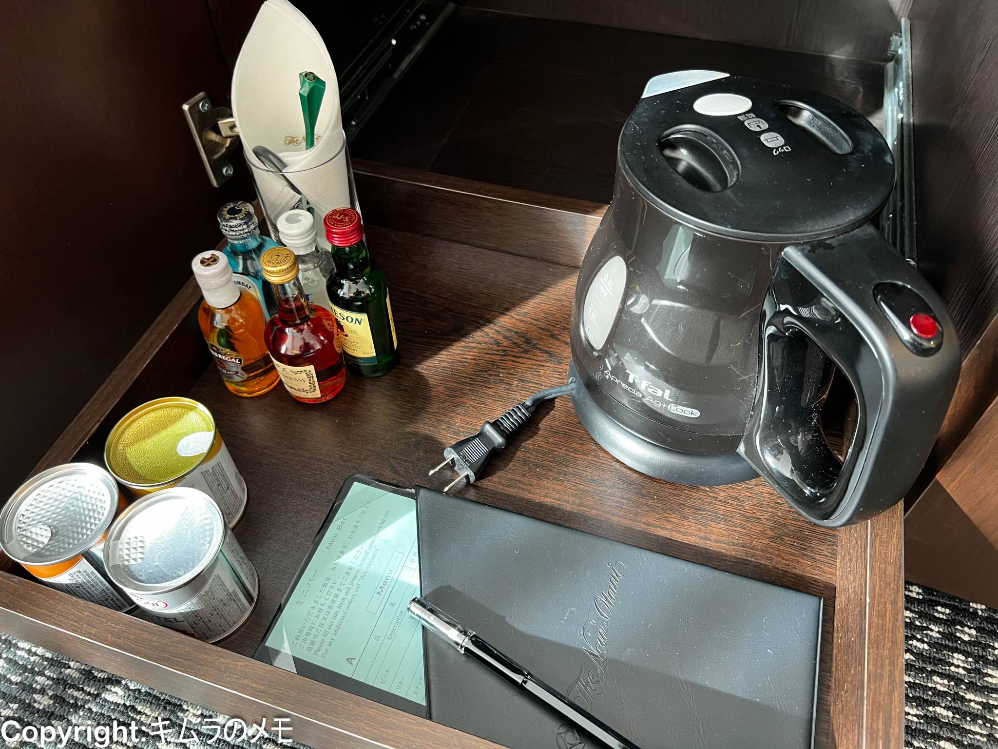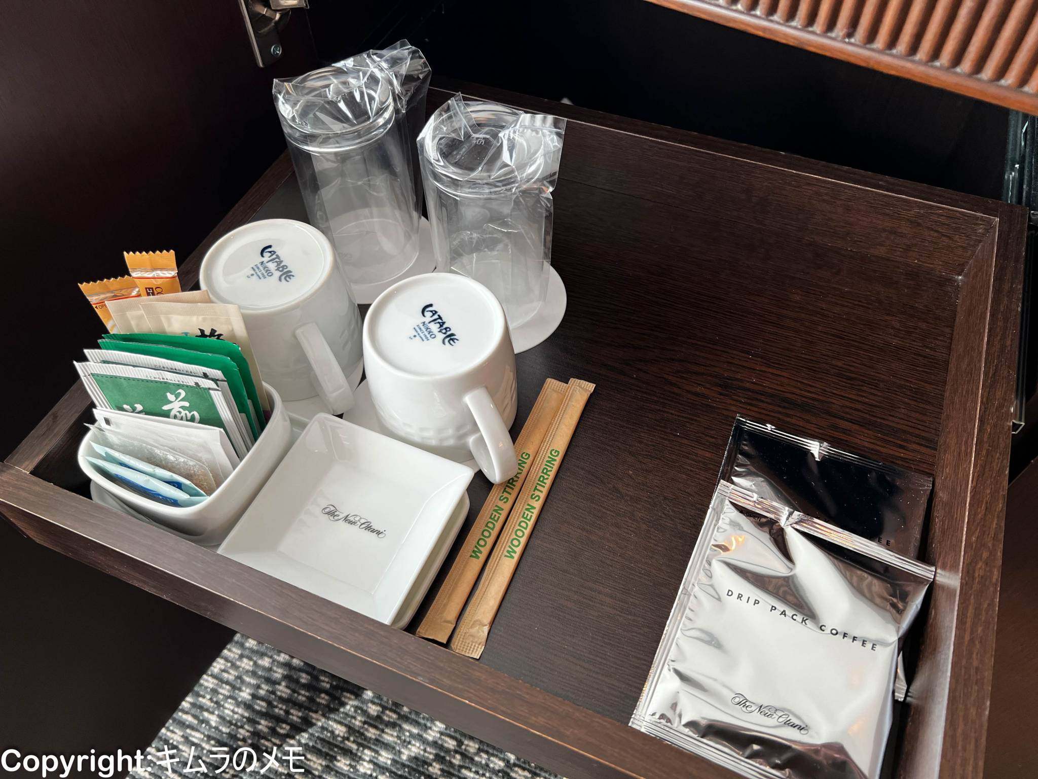 なお、テレビの下がミニバーコーナーを兼ねており、ドリップコーヒーなどが無料で用意されている。