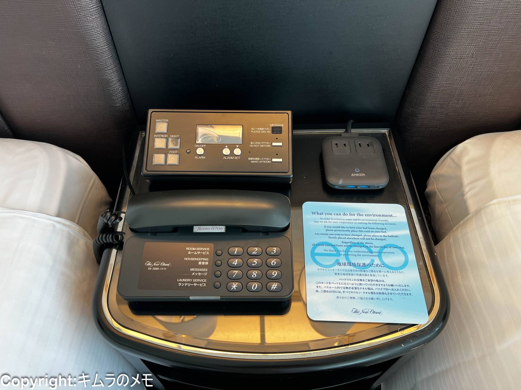 ベッドの間にサイドテーブルがあり、コンセントも設置されているので枕元で寝ながらスマホの充電も出来る。