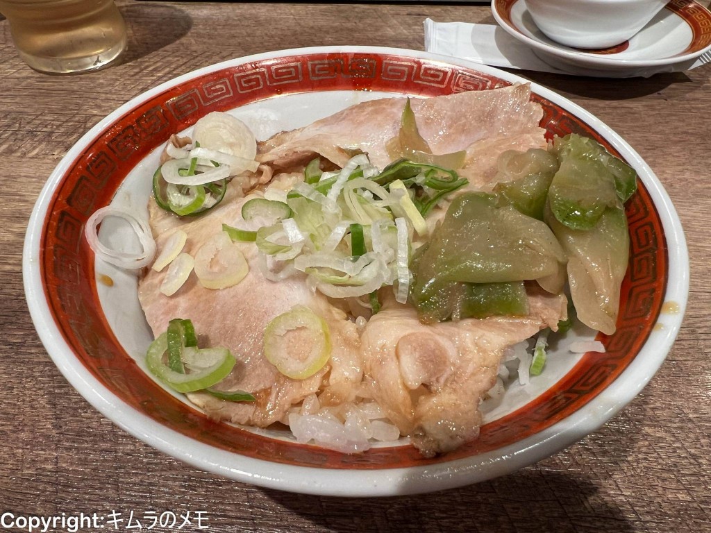 薄手のチャーシュー3枚とザーサイが乗せられたもので、サイズ感はいわゆるランチで頂くセットメニューの丼ものという感じで大きくも小さくもない。