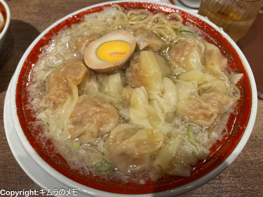 若干背脂チャッチャ系に仕上げられたスープの上には大量のわんたんが乗せられており、そこに軽く刻みネギがトッピング、半分にカットされた味付け玉子と共に提供された。