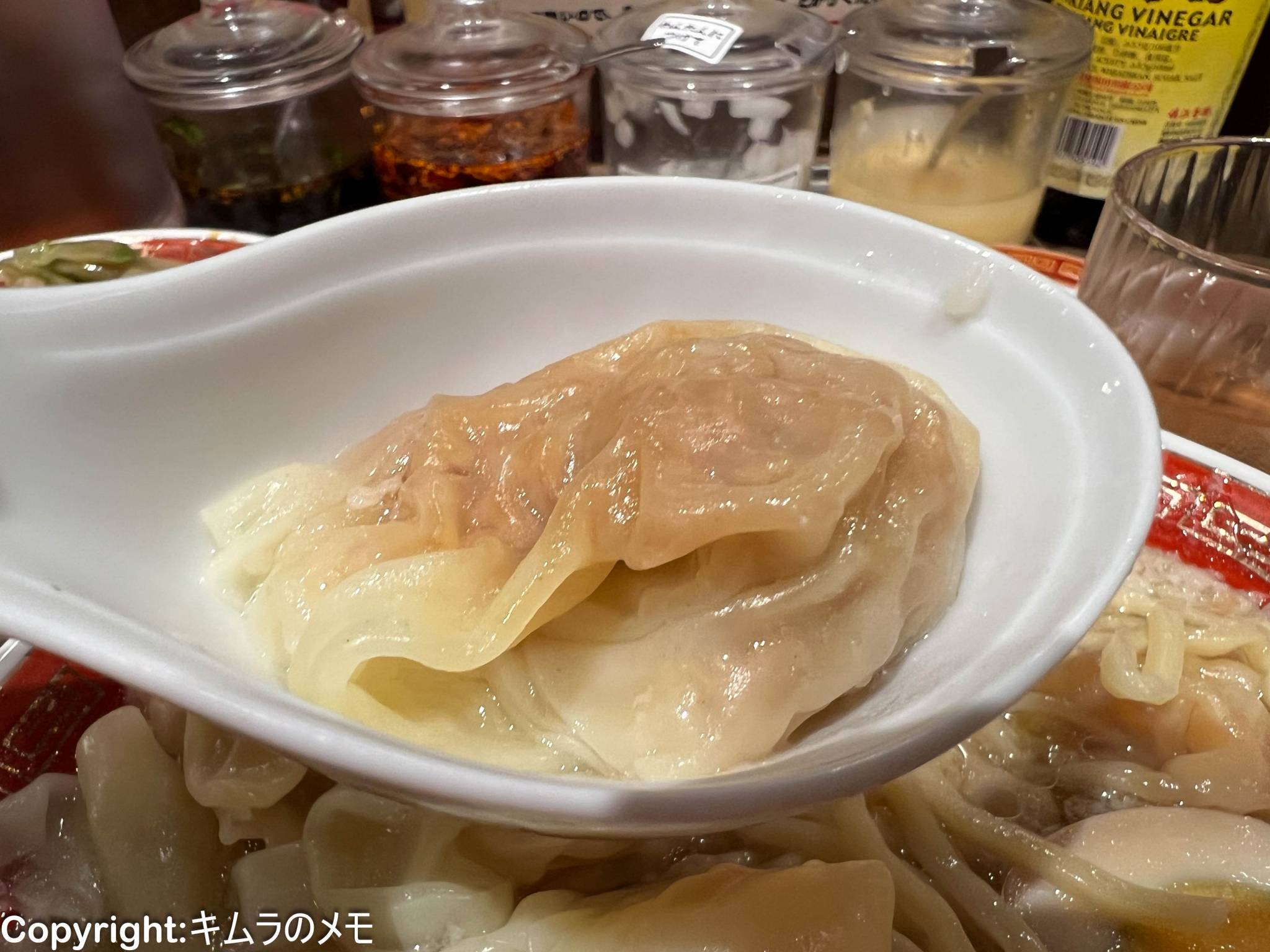 今回オーダーしたわんたんが粗挽きということで、文字通りしっかりと肉汁の旨味を感じられる粗挽きわんたんという印象。