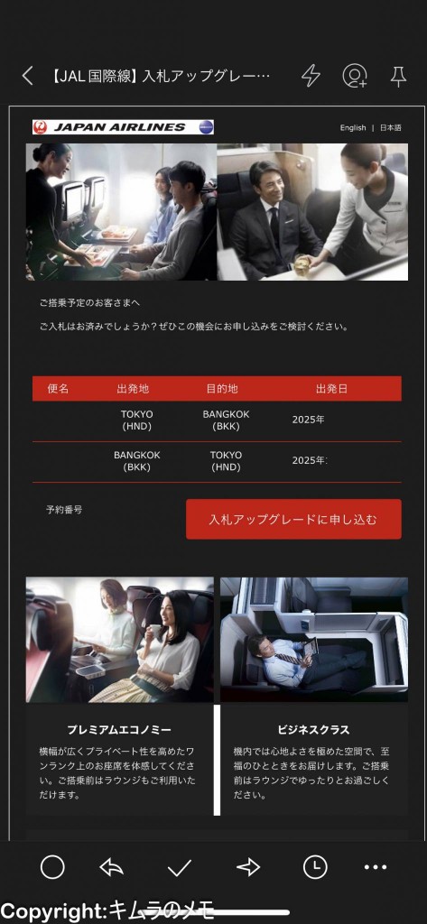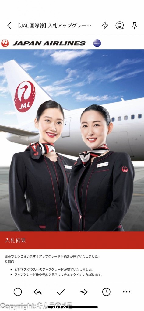 毎度の如く、フライト1週間前にアップグレード入札を促すメールを受信したものの、今回も「〆切間近!」のメールが来たタイミングで入札。
