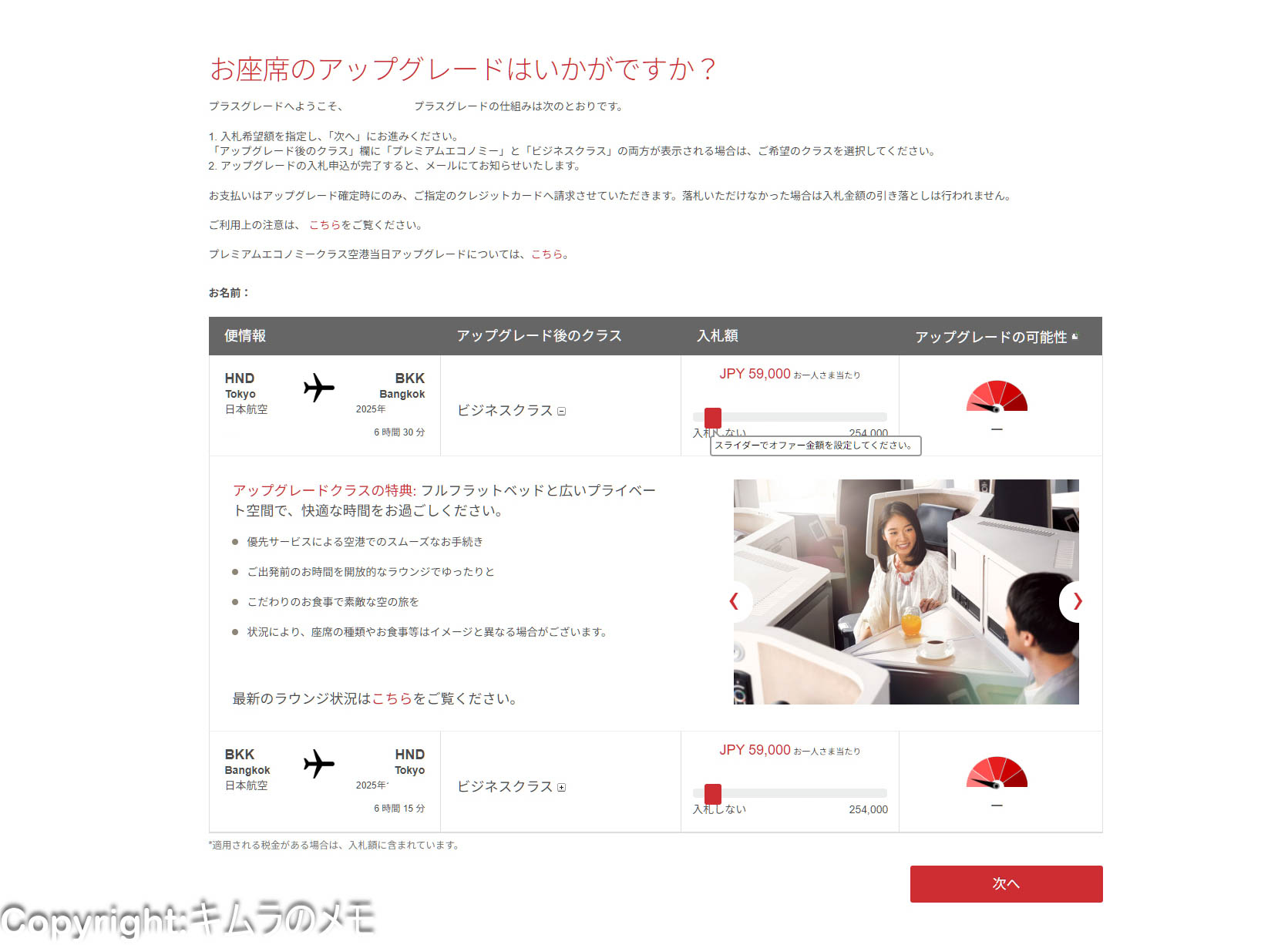 入札最低額と最高額は行先や空き状況によって異なるようだが、今回はデフォルト値が5.9万円なのは前回と同様だが、最低入札額は3.9万円、最高入札額25.4万円であった。