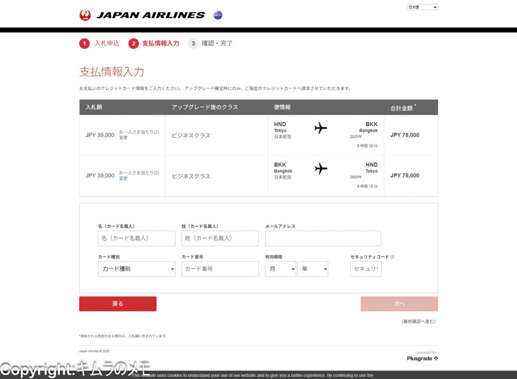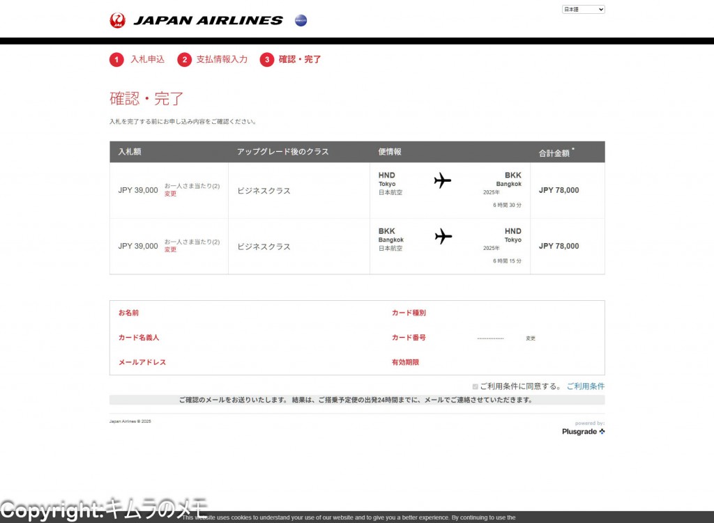 今回は最低額での入札なので通れば最安値のビジネスクラス価格よりも安い金額でビジネスクラスを楽しめるが、FOPについては予約クラスのものが適用されるので、FOP目的のアップグレードは出来ない。