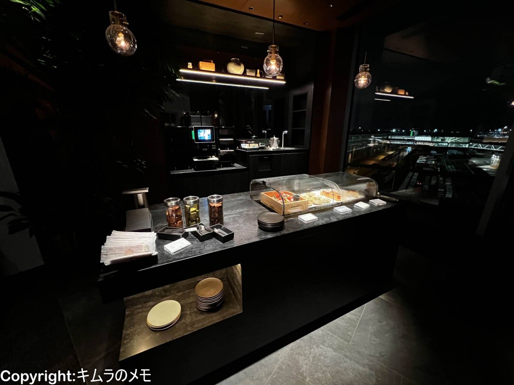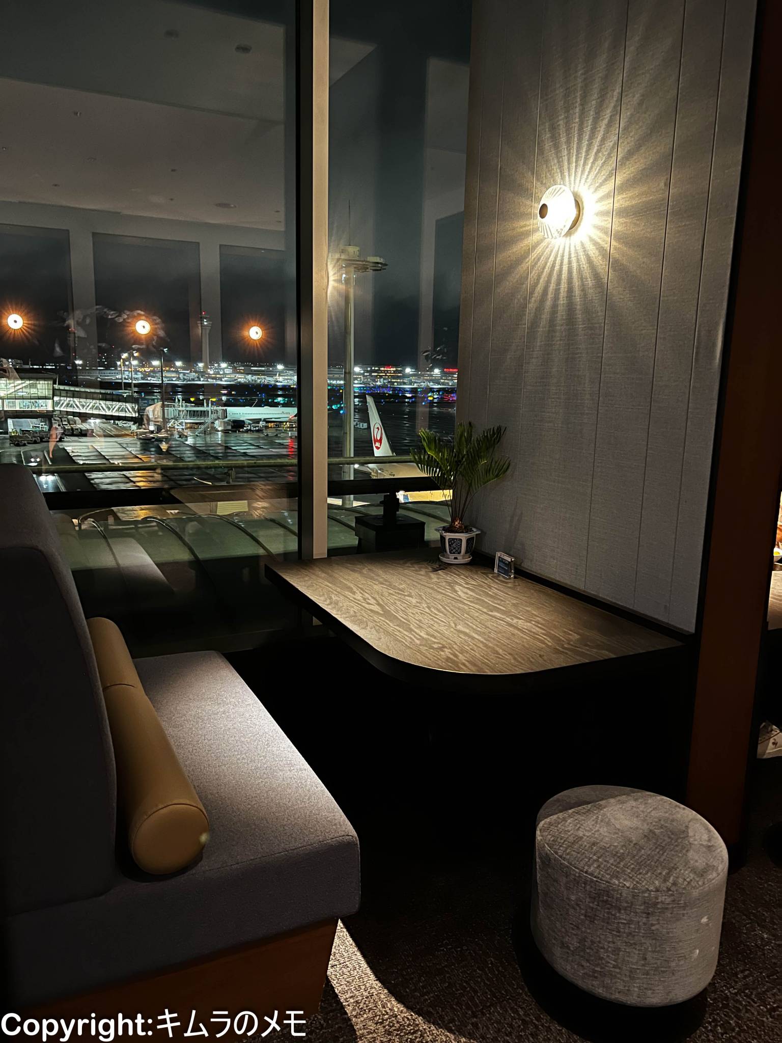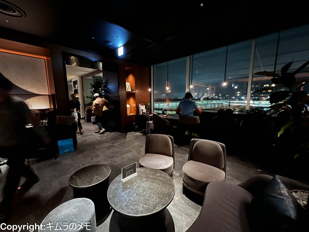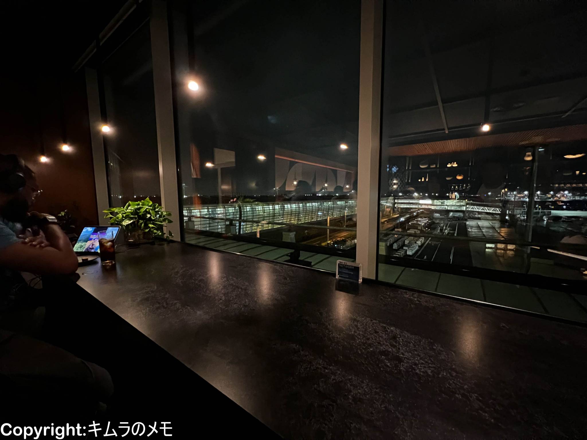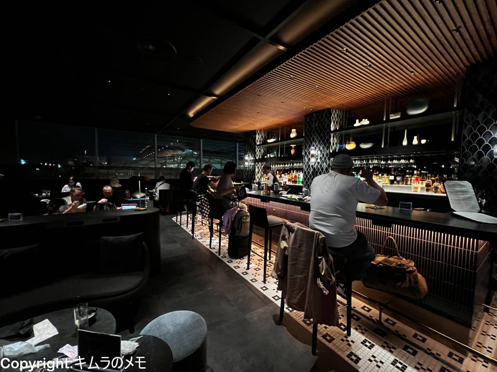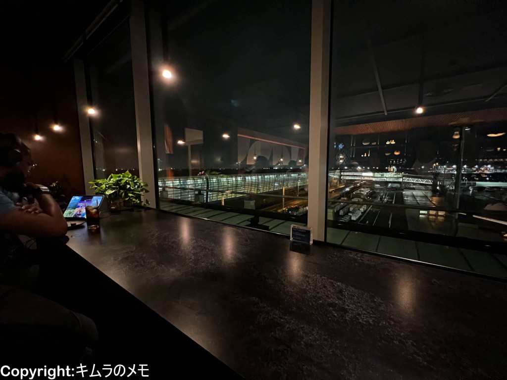 他のエリア同様にかなり照明が落とされており、ターミナルや滑走路を眺めながらお酒や食事を楽しめるのだが、JAL国際線ファーストクラスラウンジと比較すると席の間隔はかなり狭く、居酒屋のバーカウンターと同じ程度という感じ。
