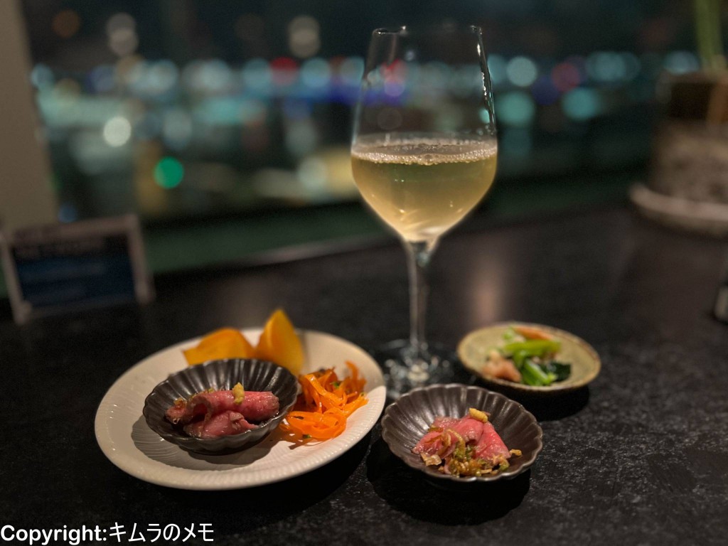 小鉢料理をつまみながらワインを頂き空港の雰囲気を楽しめるのはラグジュアリーラウンジならでは。
