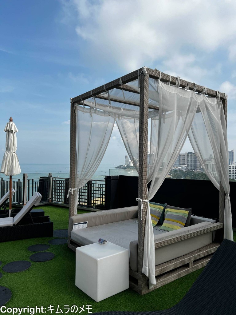 とは言え、プールから視界を遮るものが無く、パタヤビーチを一望できるのは贅沢で、ドーム状のベッドで寝ころべばあっという間に時間が過ぎてしまう贅沢空間で過ごす時間は何物にも代えがたい。