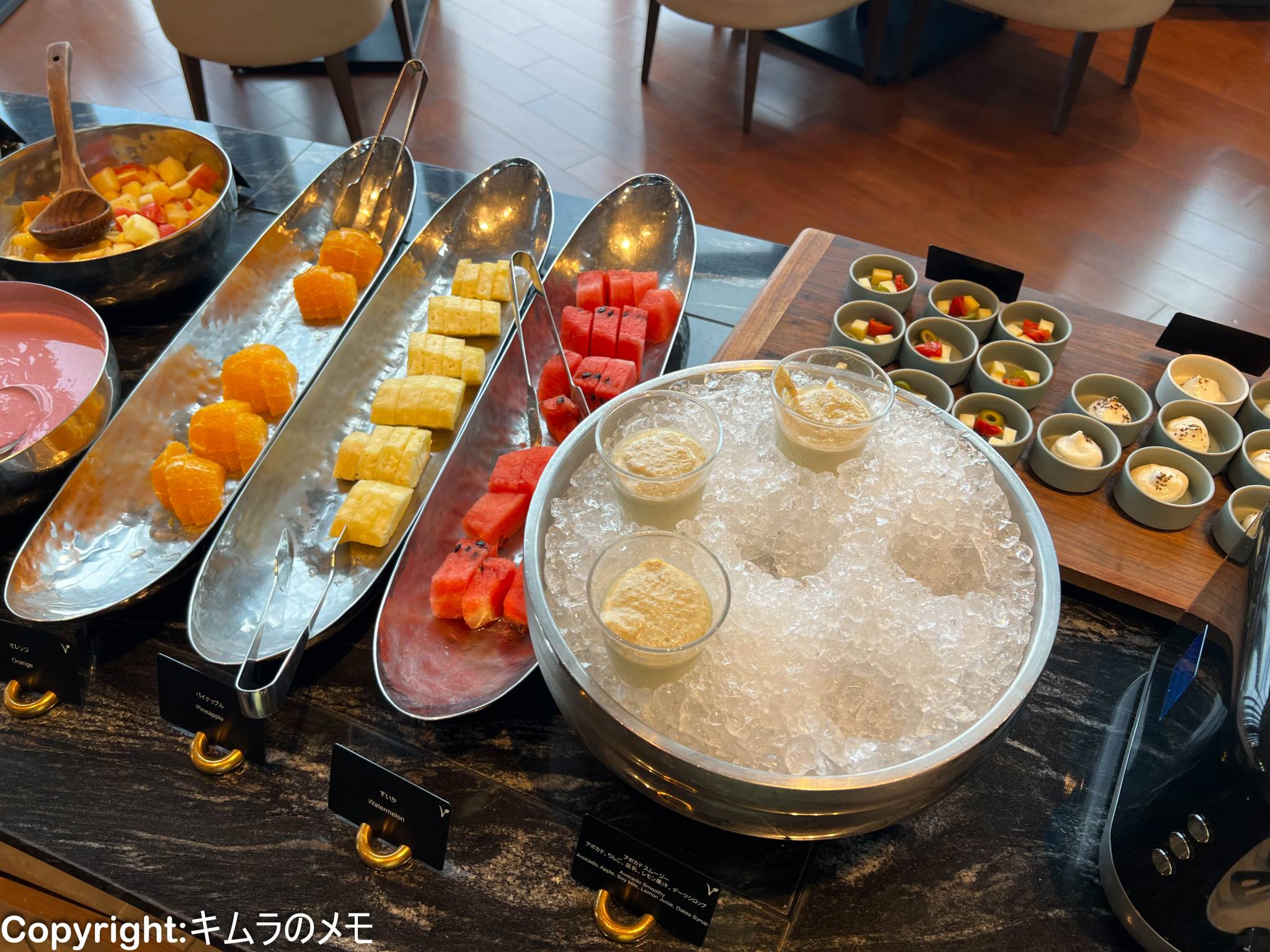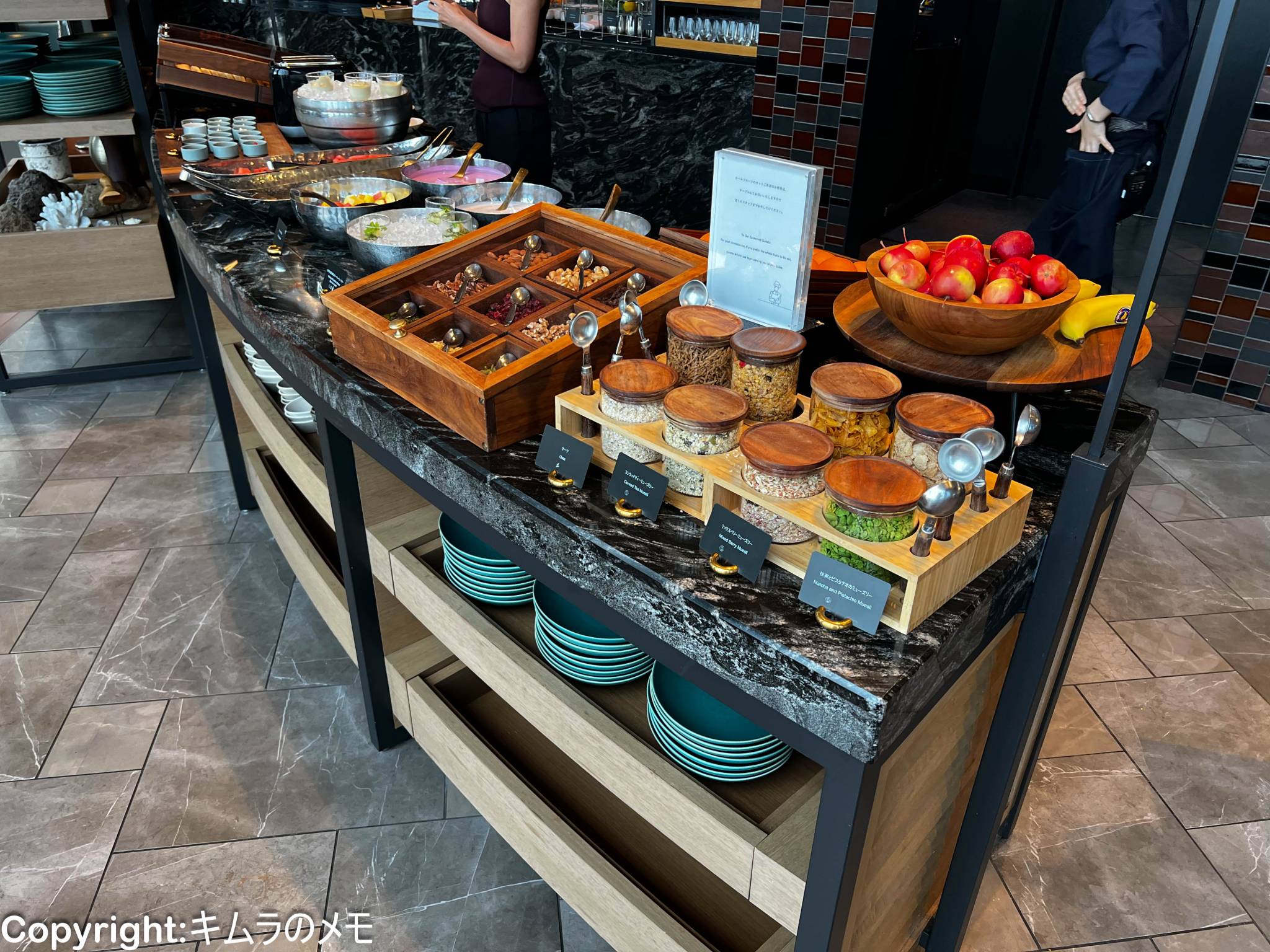 こちらではシリアルやドライフルーツ、そして奥側ではフルーツなどが提供されている。