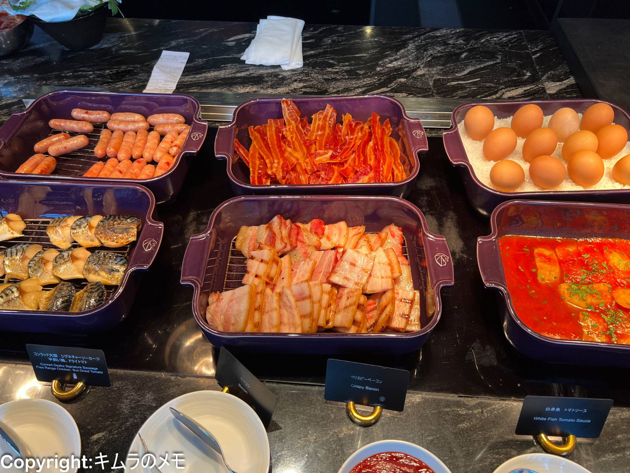 その横にはソーセージやベーコンなどの洋食ビュッフェ定番メニューに加え、焼き魚などの和食メニューもしっかりと用意されている。