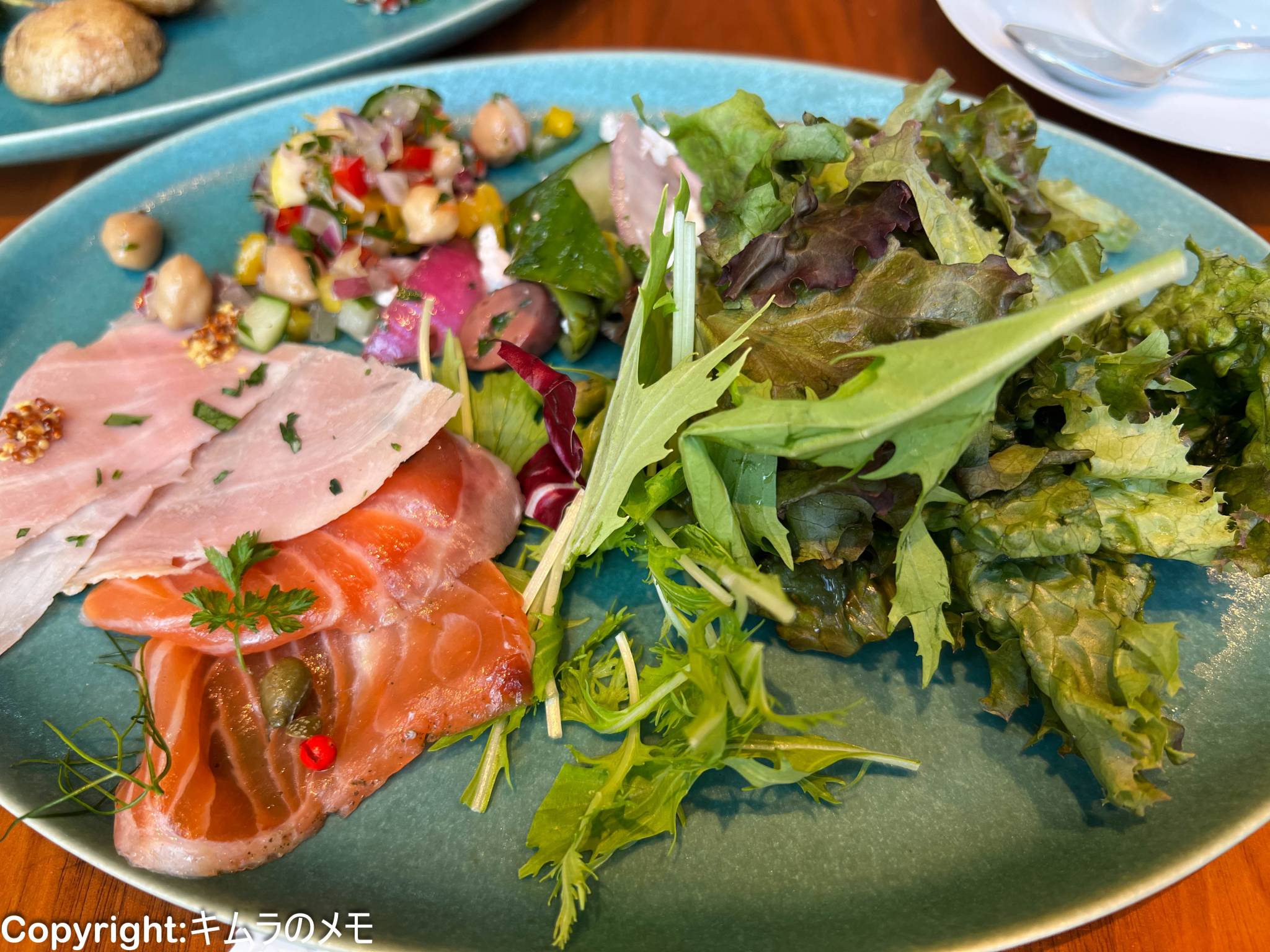 リーフサラダやスモークサーモン、そしてレンズ豆サラダなどもあり、オシャレ感は抜群。