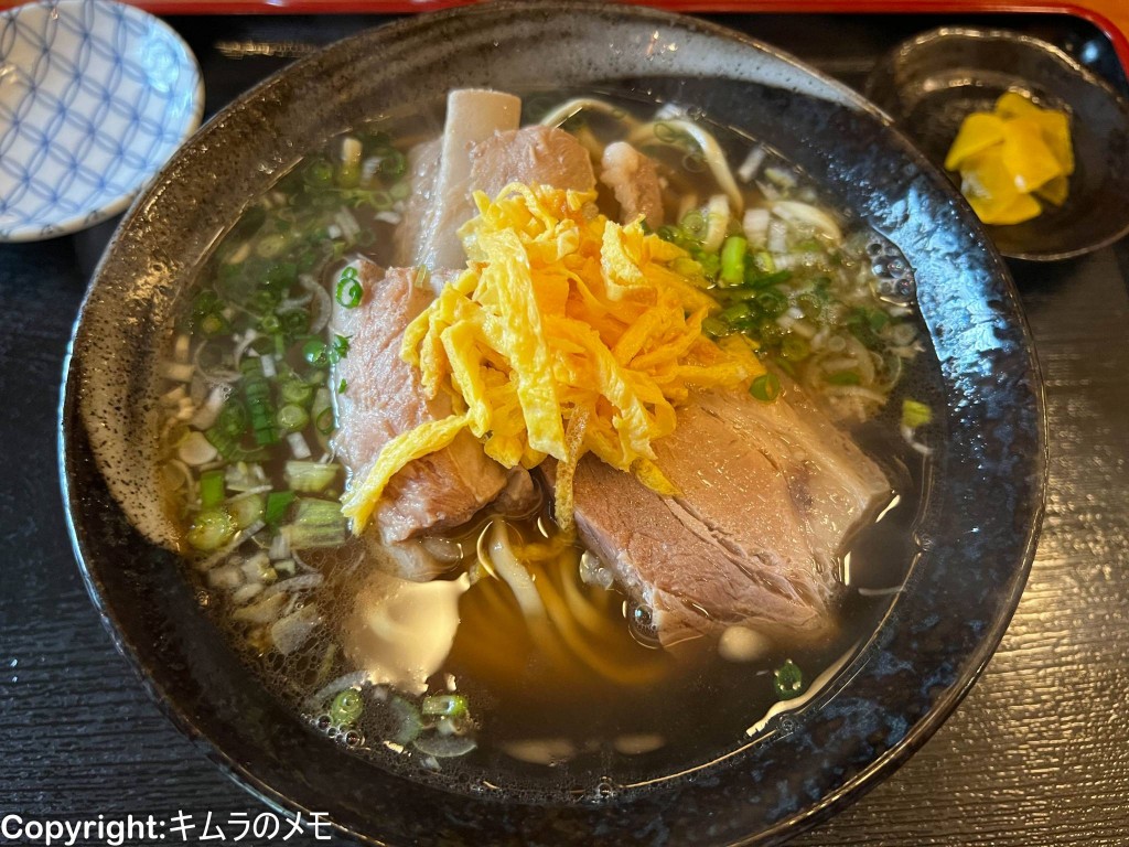 本そーきが2つと三枚肉がトッピングされ、その上には錦糸卵が乗せられたもの。