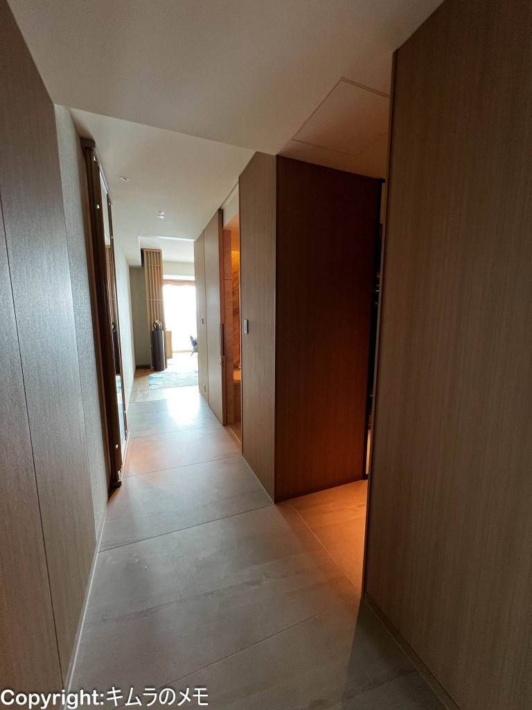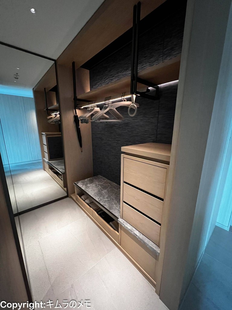 今回の部屋はプレミアムタイプということで、客室入口横にウォークインクローゼットスペースが贅沢に確保されている。