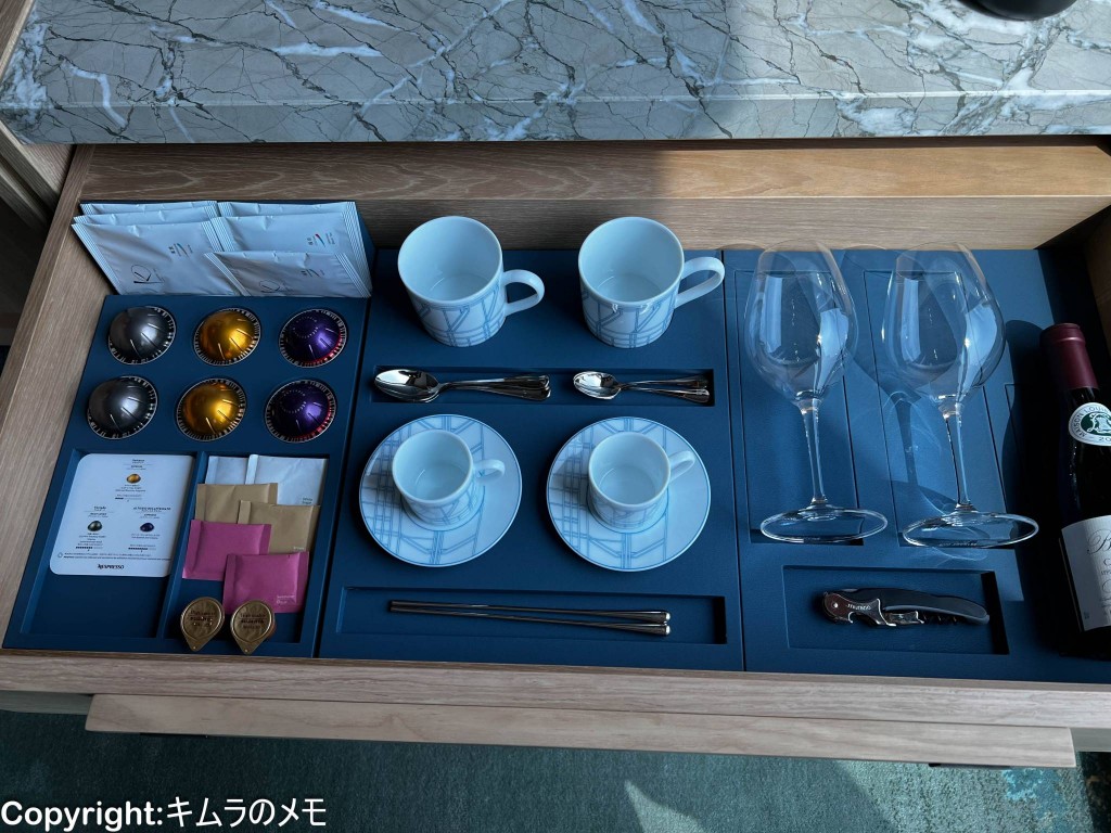 コーヒーはドリップタイプとカプセルタイプが予め用意されていたり、グラス類も豊富に準備されている。