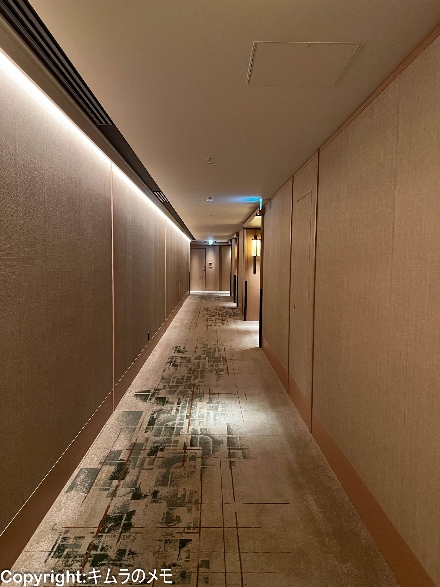 客室に向かう通路は明るめのアースカラーと間接照明を使い、上品な雰囲気となっている。