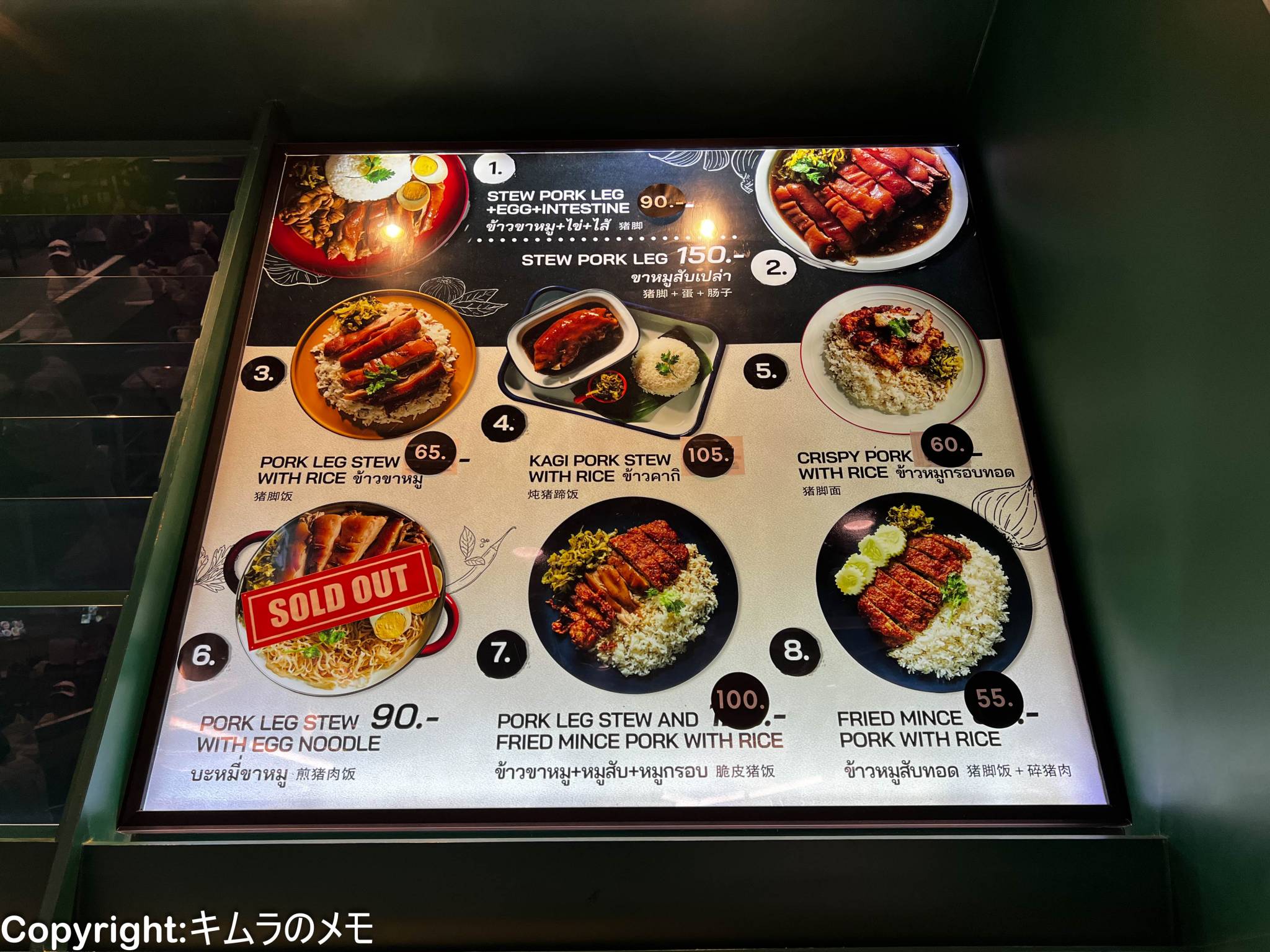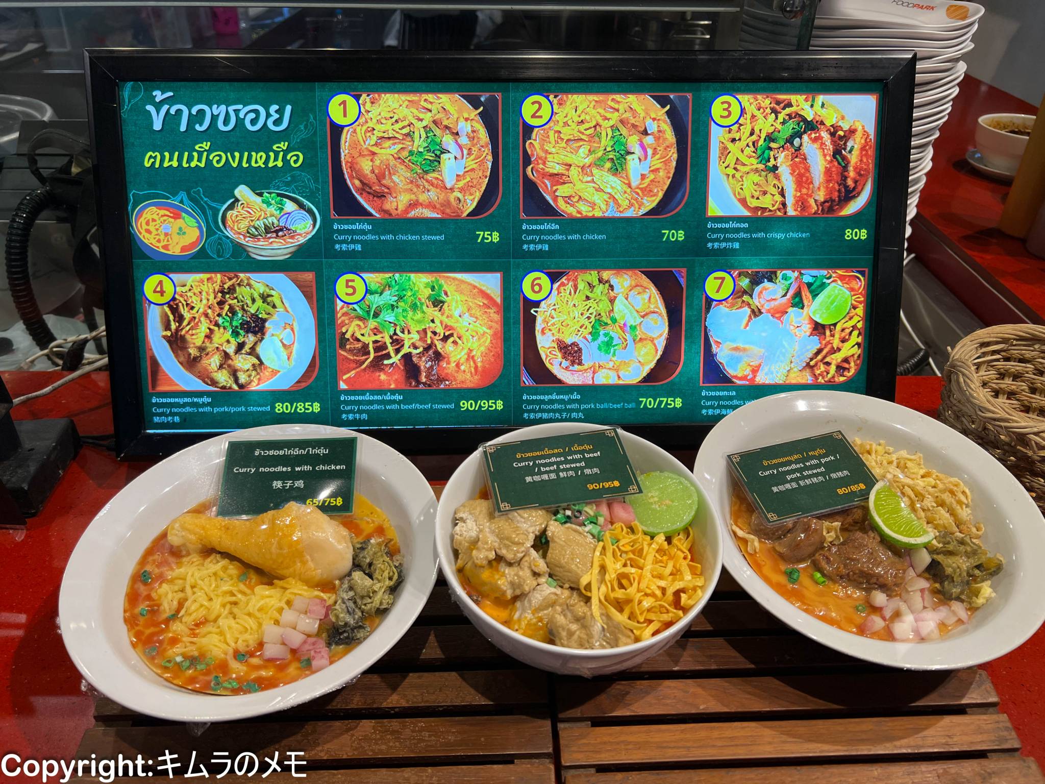 最終的にはカオソーイの店では「牛肉入りカオソーイ(90バーツ)」を、もう一つの店では「Crispy Pork with Rice(60バーツ)」をオーダーした。