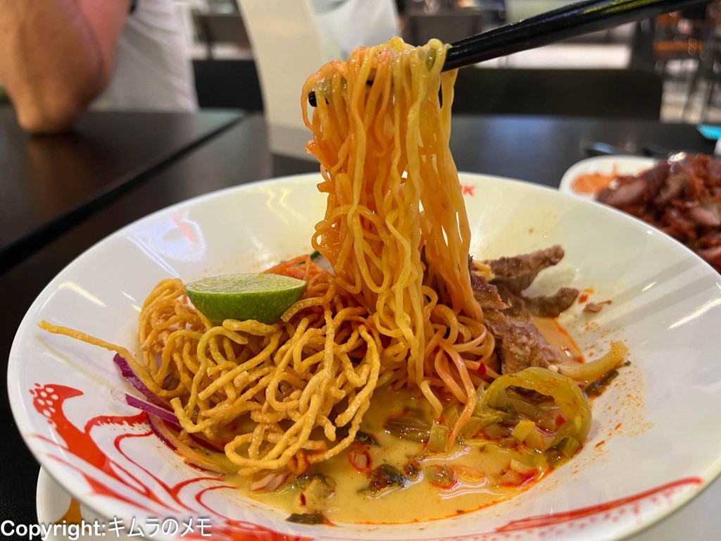 本場チェンマイで食べたものと比較するとグリーンカレーの辛味を抑えてそこにココナッツミルクで甘味と柔らかさを加えたような味わいのスープは若干コクが足りない。