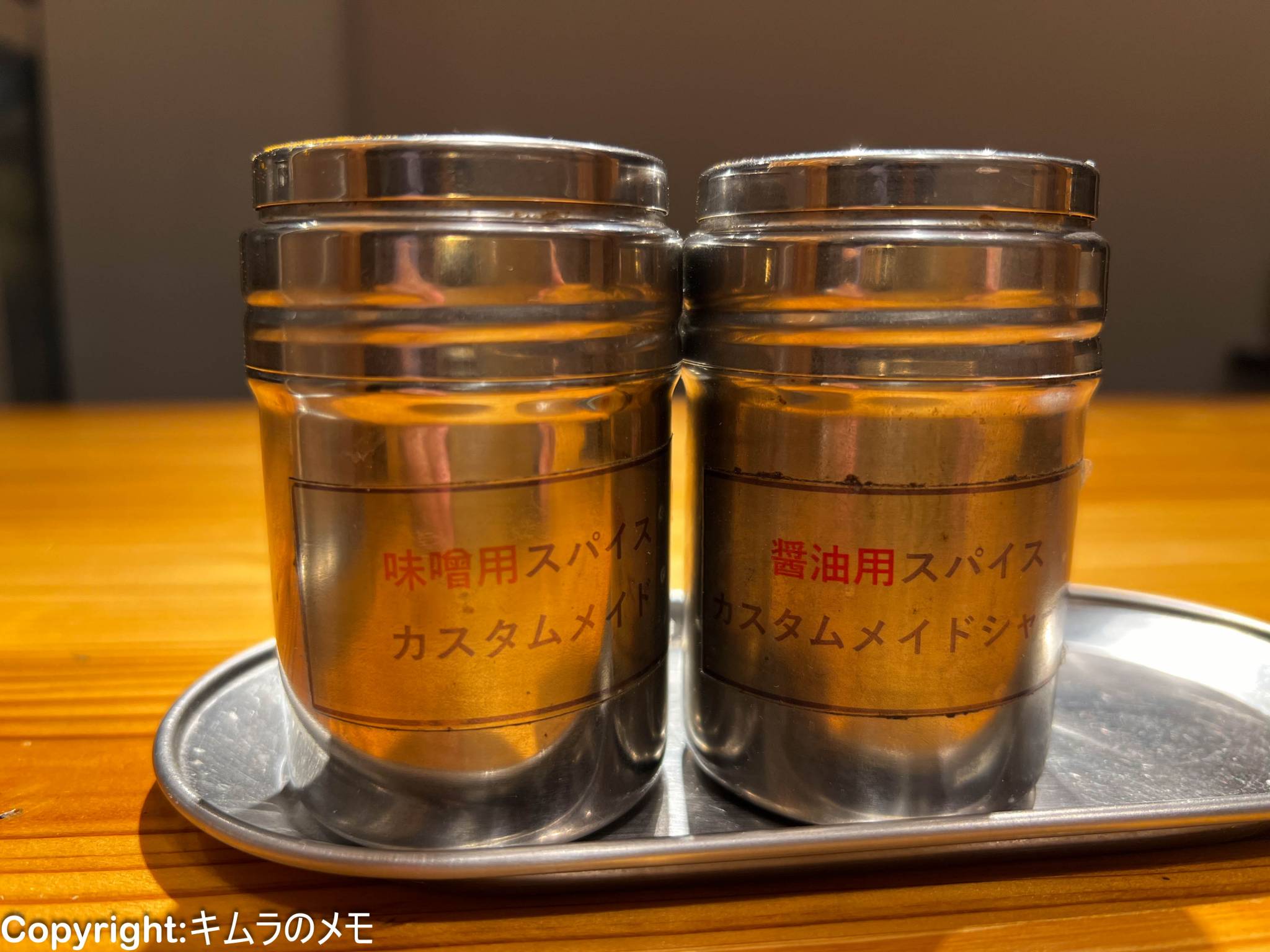 テーブルには、醤油ラーメン用と味噌ラーメン用の味変スパイスがセットされている。