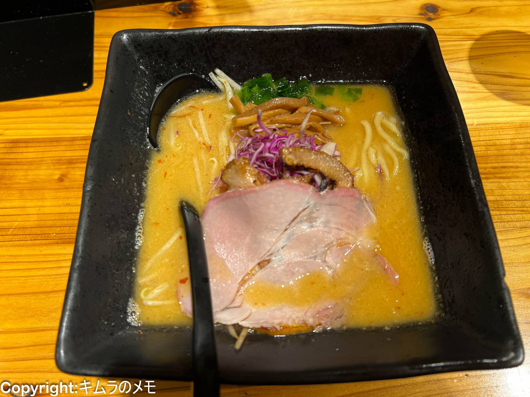 他のラーメン店ではあまり見ない四角い器に、旭川ラーメンのような油の層があるスープがたっぷりと入っている。