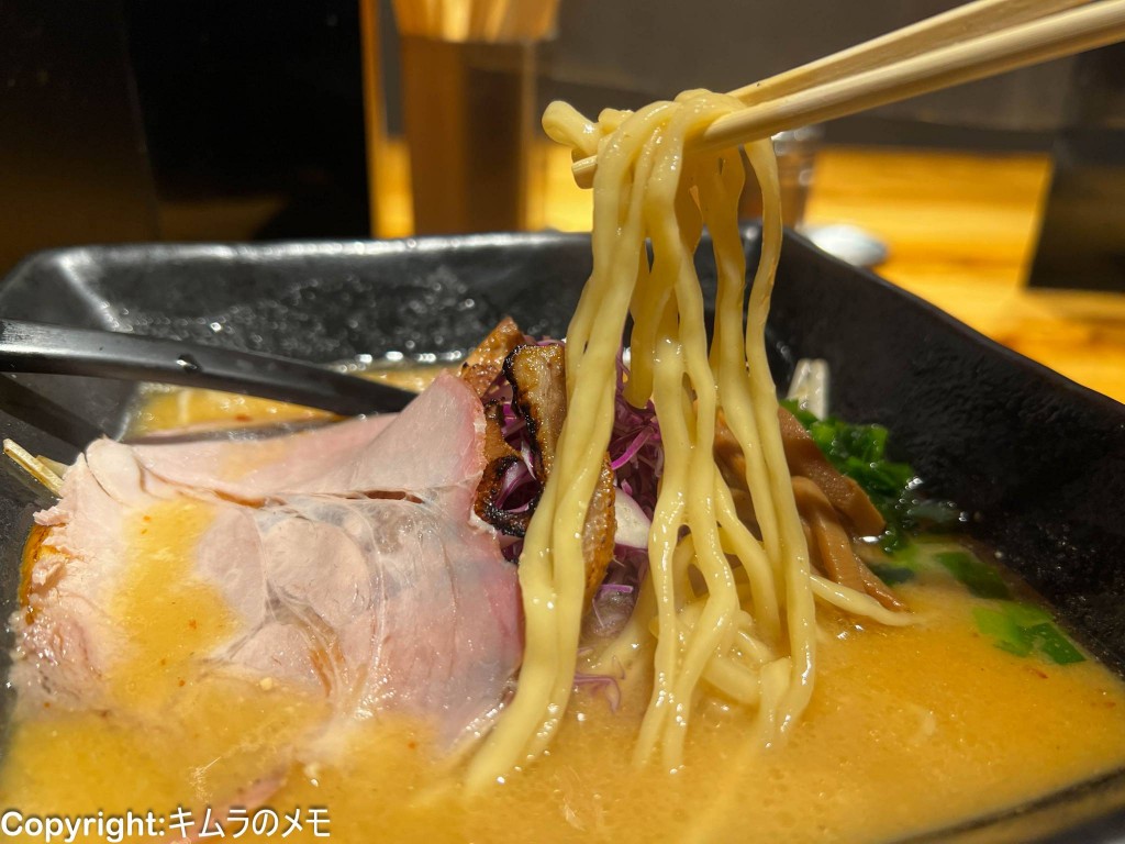 表面の油の層の効果もあってか、スープはアツアツで、程よくニンニクの風味が感じられるがパンチのあるガッツリ系の味わいではなく上品な味わいになっている。