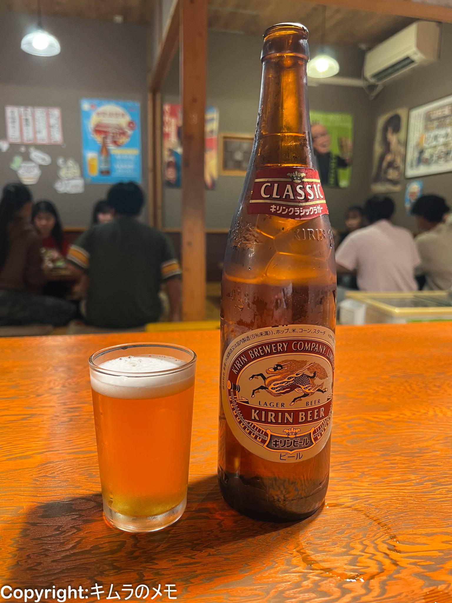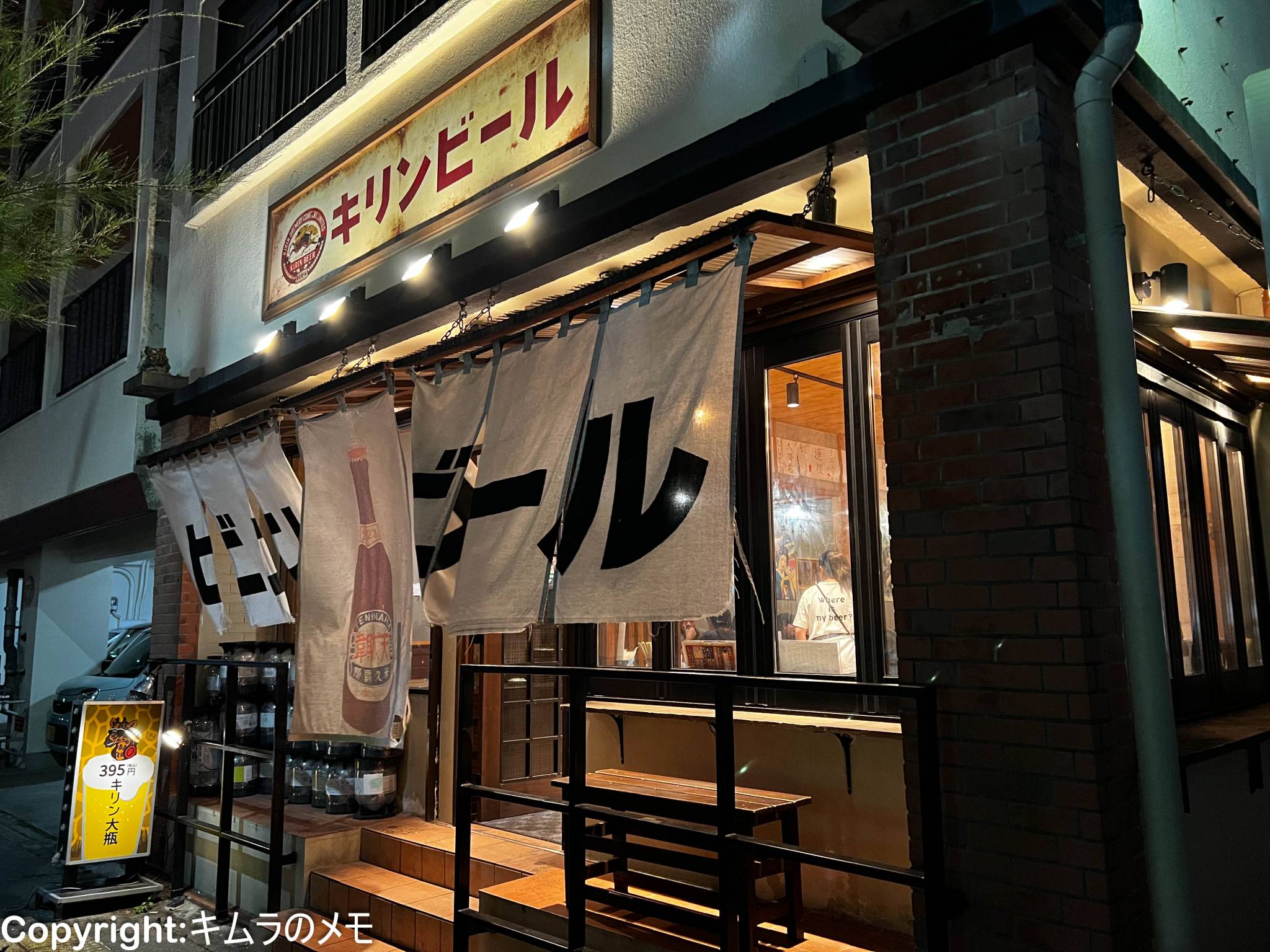 店の前には「キリンビール」の看板と「ビンビール」と書かれた大きな暖簾がかかっている。